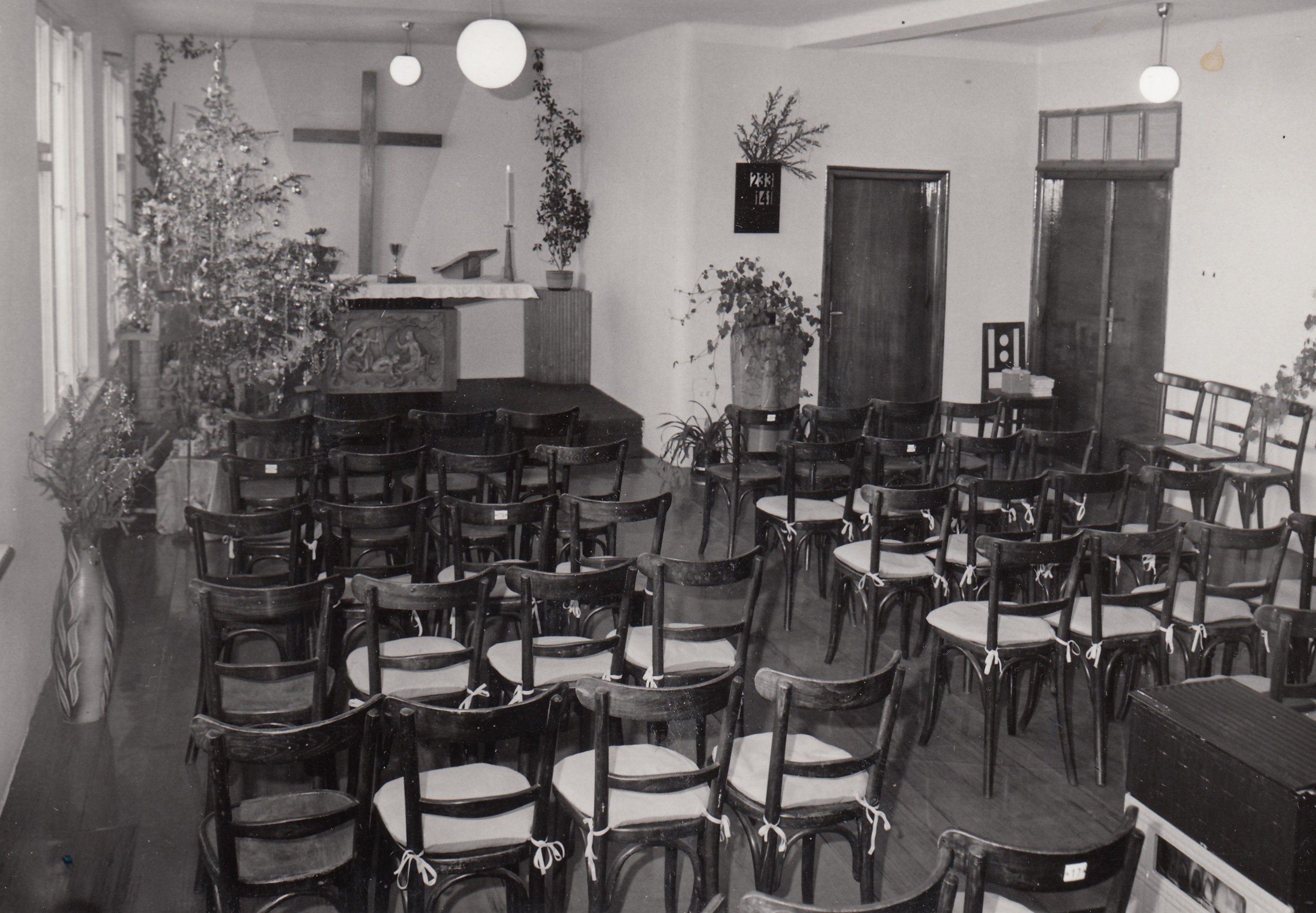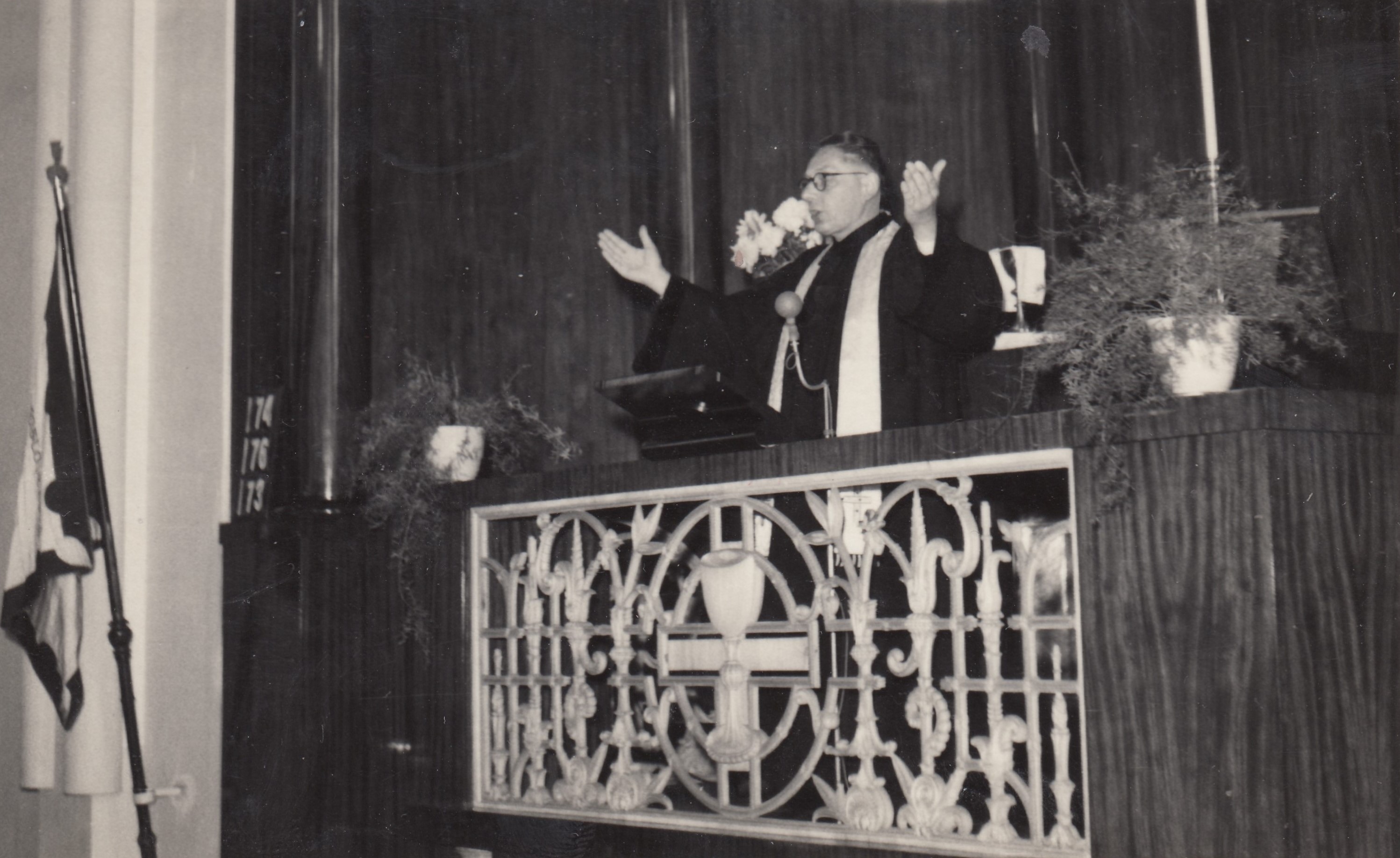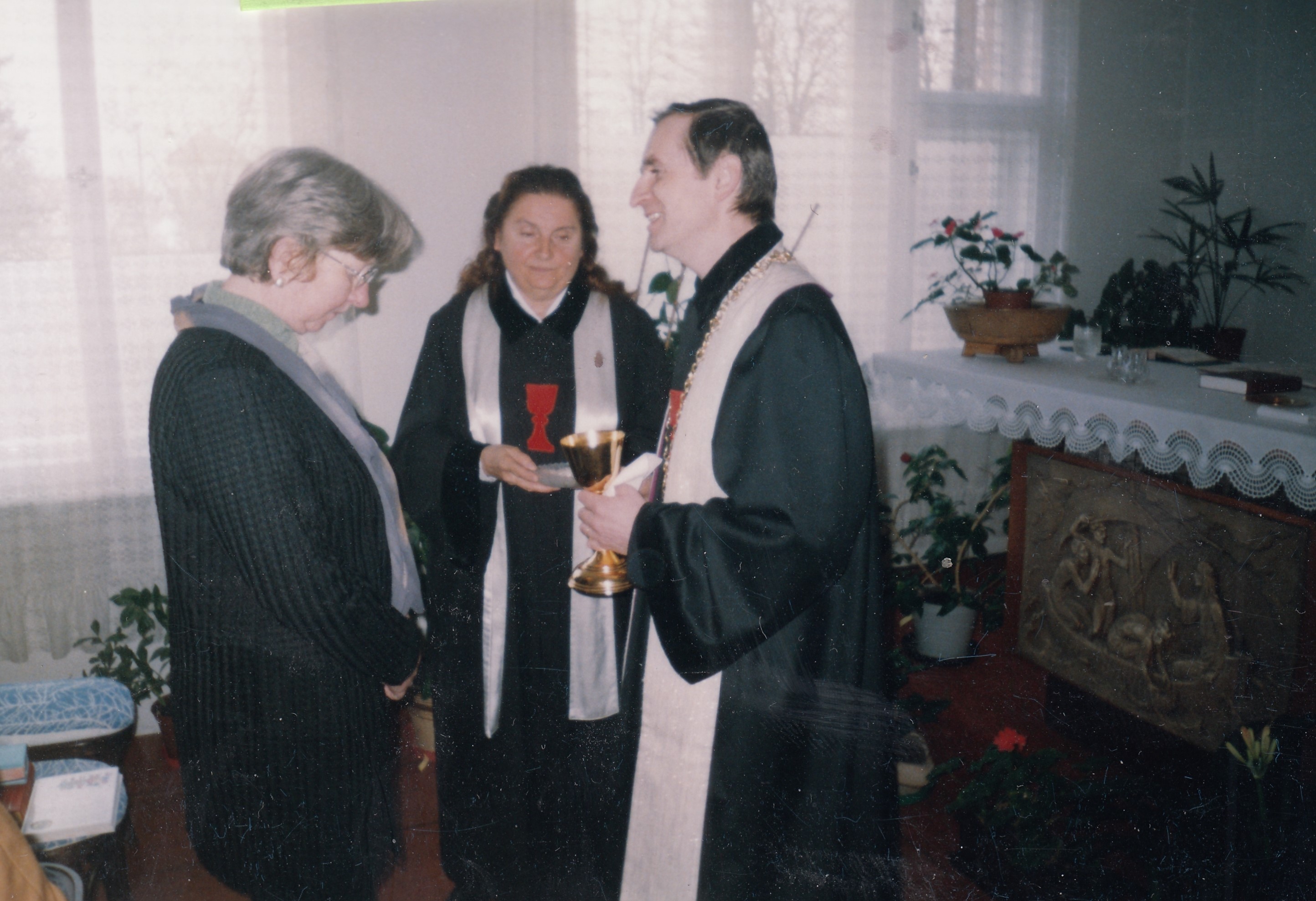Pohřeb otce Karla Salfického, zleva biskup Josef Pochop, farář Miroslav Spáčil, ??, farářka Dagmar Spáčilová, maminka Františka, Helena Salfická, Olomouc, 1972.