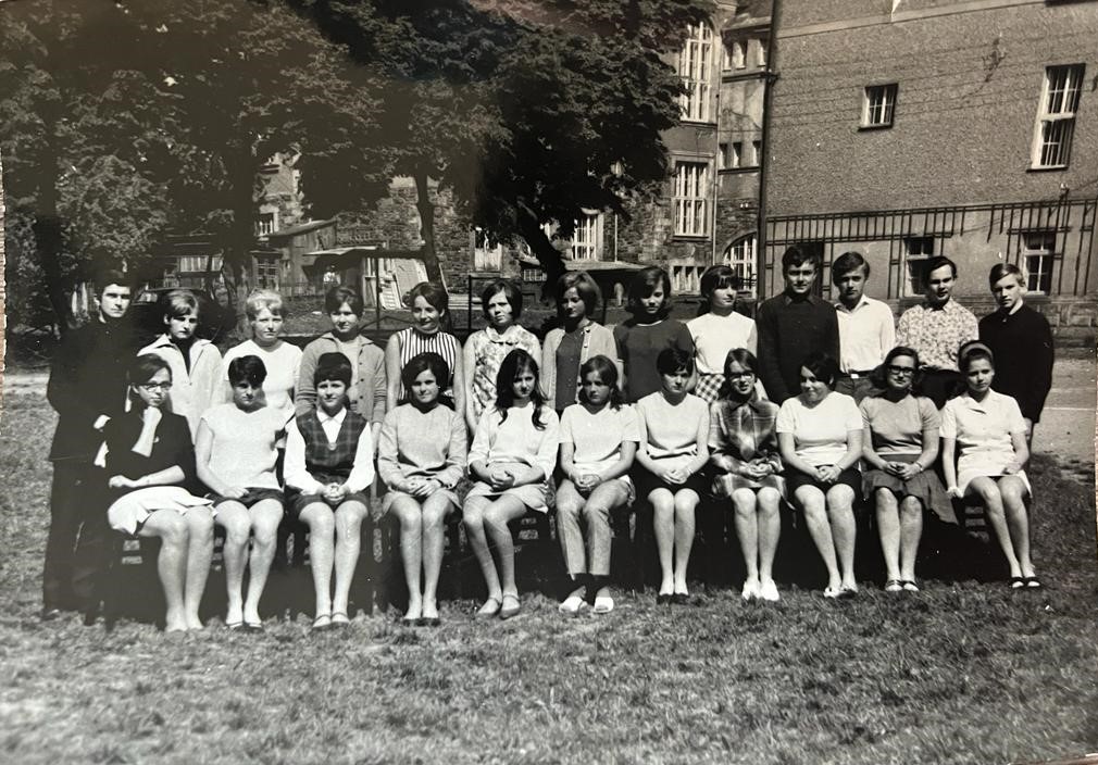 Třídní fotografie ze Střední všeobecně vzdělávací školy, 2. ročník (Alexander stojí zcela vpravo, spolužačka Hana Špičková Juptnerová čtvrtá sedící zprava), Vrchlabí, 1969