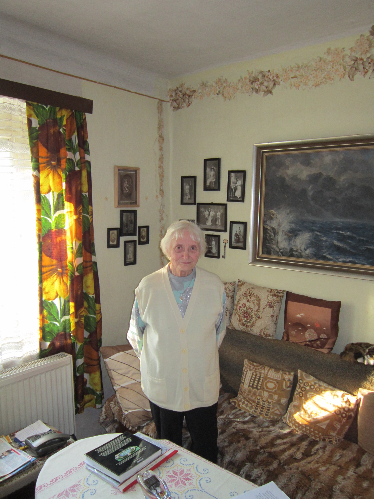 „Byli tady Rusi a já jsem byla schovaná tam pod střechou, jak je ten kopec. Rusi mně nic neudělali, protože jsem byla schovaná. V těch pokojíčkách, jak bydlela paní Gesslerová, potom bydlela paní Jablonská. Já jsem byla kolik dní schovaná pod střechou. Nic jsem nejedla. To bylo hrozný, a ona říká: ,Víte, já se umím domluvit s Rusama. Pojďte dolů, ať se můžete jednou vyspat.‘ Tak jsem se umývala, a najednou dole na dveře: ,Bum, bum, bum.‘ Ona říká: ,Já neotevřu.‘ Já jsem řekla: ,Ježišmarja, běžte otevřít. Nevíte co, vždyť můžou rozbít dveře.‘ Ona říká: ,Zůstaňte ležet v posteli.‘ Mně říkal můj hlas: Nezůstávej. Vlezla jsem pod postel. Přišli tři Rusi. Já jsem pod postelí nic neviděla. Jenom ty nohy. A ona mluvila polsky. Nerozuměla jsem jí. Mluvila takovým hlasem, byl v něm hrozný strach. Já jsem si říkala: ,Ježiš, to musí být něco strašnýho.‘ Viděla jsem jenom ty nohy. Byla jsem blbá. Nevěděla jsem, co to je, co dělají, opravdu. A včil jsem slyšela, jak ona německy říká: ,Herr Gott wird Sie strafen.‘ Pán Bůh Vás ztrestá.“