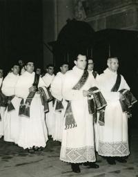 „Pak jsem se dověděl, že najednou Pavel Třebín je v Československu. A tak jsem se ještě ptal na kongregaci seminářů a tam jsem se dověděl, že kongregace seminářů zamezila jeho svěcení na kněze. Takže, domníval jsem se, tím, že najednou on viděl, že cesta ke kněžství je v zahraničí pro něj uzavřena, tak že neváhal dát se do služeb státní policie, jít na československý vyslanectví, vrátit se tam do Československa a tam se dát vysvětit. Vysvětil ho prý tenkrát biskup Pobožný, slovenský biskup. S jakým doporučením nebo s jakým svědomím ho světil, to nevím. Rozhodně tedy ho musel světit pod nátlakem policie. A on se tedy skutečně potom tím knězem stal. Když pak jsem já jako už italský občan se vrátil na několik dnů do Československa, tak tam jsem se dověděl od jednoho našeho kněze, že prostě Třebín je agent. Já jsem byl pořád toho mínění, že vlastně on odcházel s čistým svědomím, s vůlí stát se knězem v zahraničí, a že teprve, když mu to bylo znemožněno, tak že teprve potom se rozhod pro spolupráci s policií. Jenomže z těch dokumentů, který vyšly najevo po revoluci, vyplývá jasně, že on už tam byl poslán jako informátor. Takže já najednou jsem viděl celé své dobrodružství v jiném světle. Jaksi, najednou jsem viděl, že jakoby, jsem byl zatažen do hry, o které jsem neměl vědomí, jo, protože v životě by mně nepřišlo na mysl, že budou posílat někoho jako špiona do Říma, do Československý bohoslovecký koleje. To prostě bylo mimo veškerý moje představy. Takže tady jsem vlastně nevěda kryl cosi, jo, o čem jsem neměl tušení.“