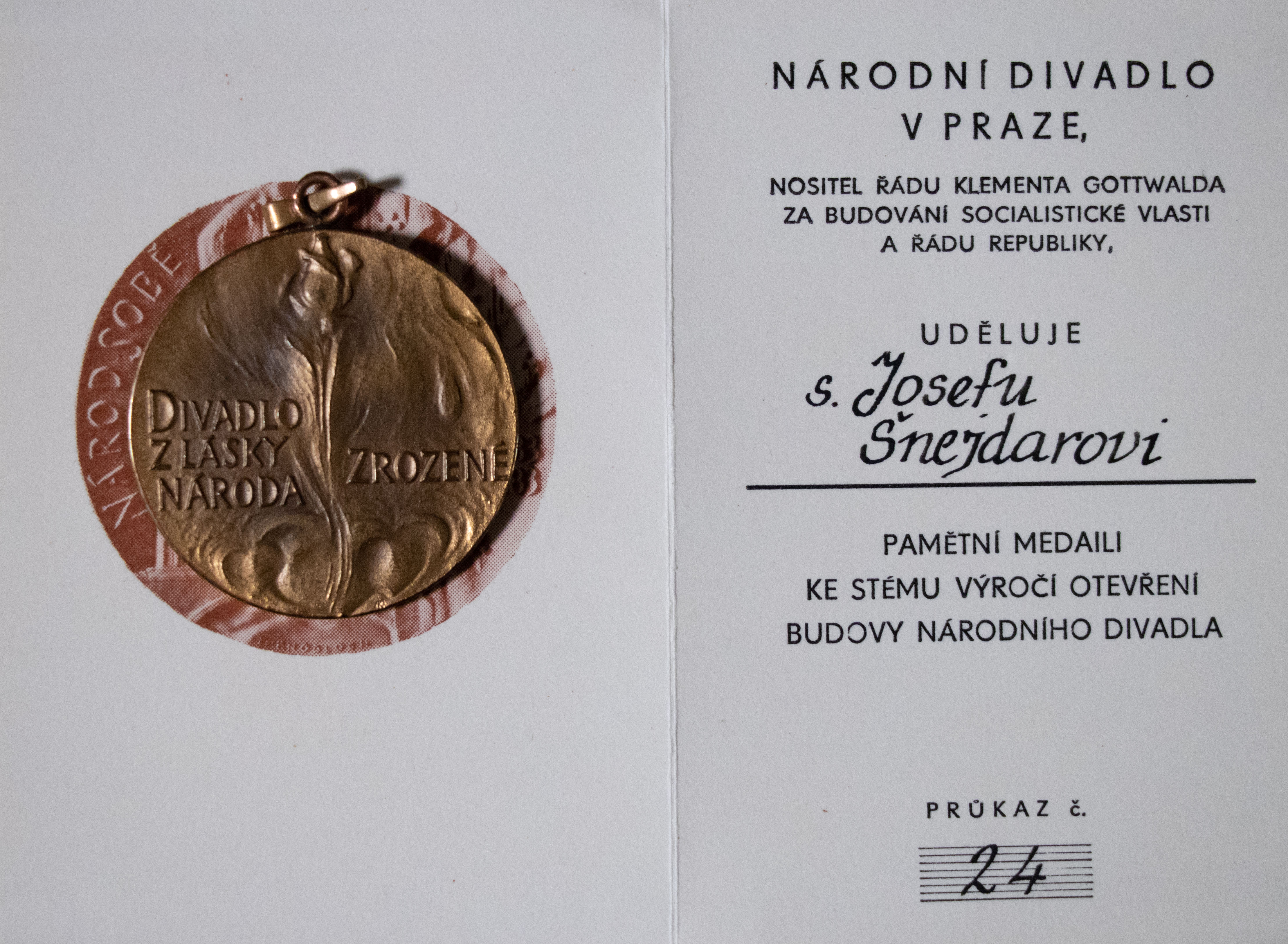 Josef Šnejdar při znovuotevření Národního divadla po rekonstrukci 18. listopadu 1983 s prezidentem Gustávem Husákem a předsedou federální vlády Lubomírem Štrougalem. Po projevu předsedy Federální vlády Lubomíra Štrougala publikum zhlédlo Smetanovu operu Libuše. Slavnostního otevření se zúčastnil i prezident ČSSR Gustav Husák, který v průběhu přestávky představení přijal v prezidentském salonku představitele hlavních rolí a členy uměleckého souboru Národního divadla