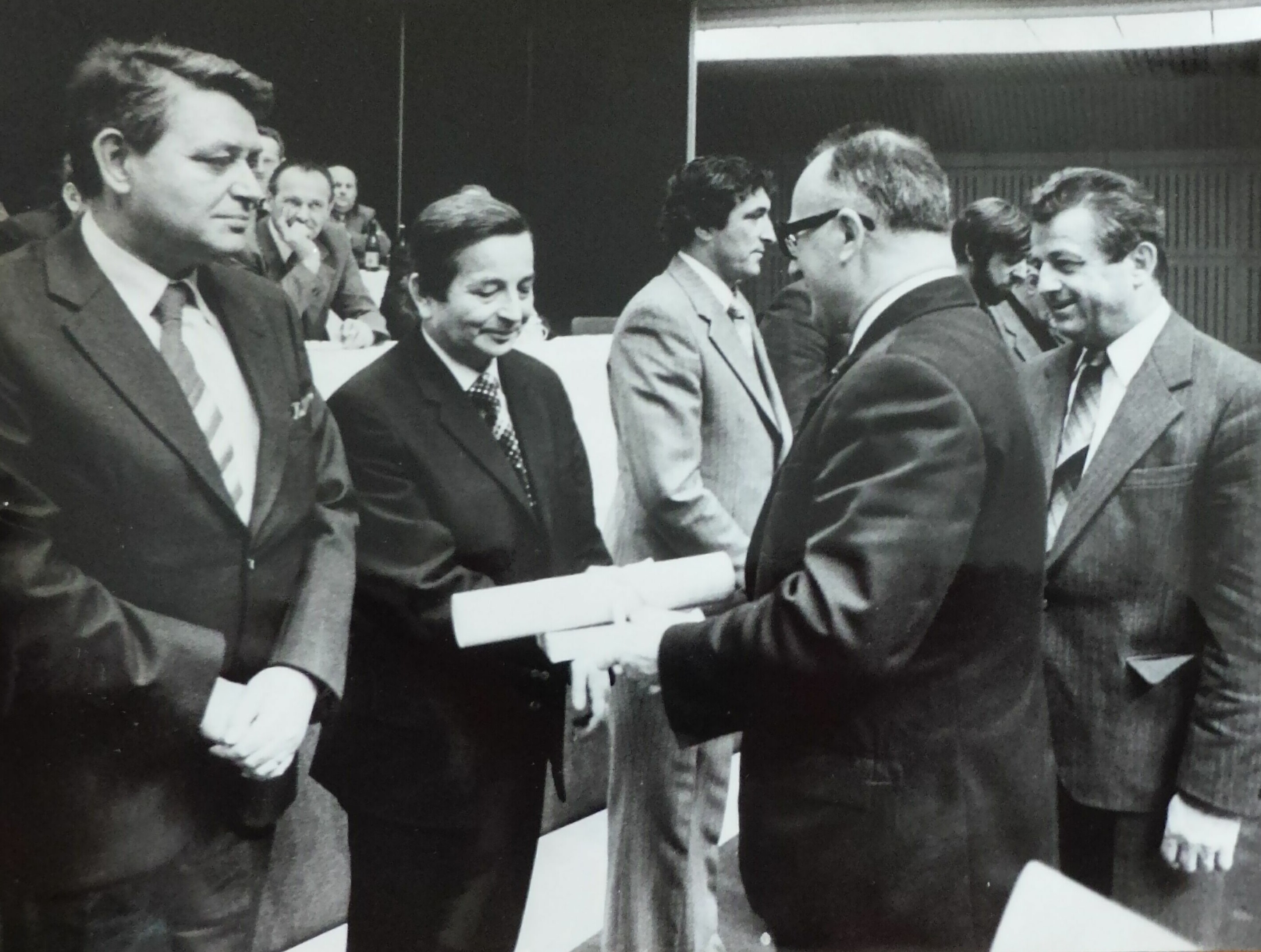 Josef Šnejdar přebírá Řád práce jako vedoucí inženýr staveništního závodu pro výstavbu Paláce kultury národního podniku Průmstav (vedoucí tajemník městské organizace KSČ v hlavním městě Praze Antonín Kapek vpravo)