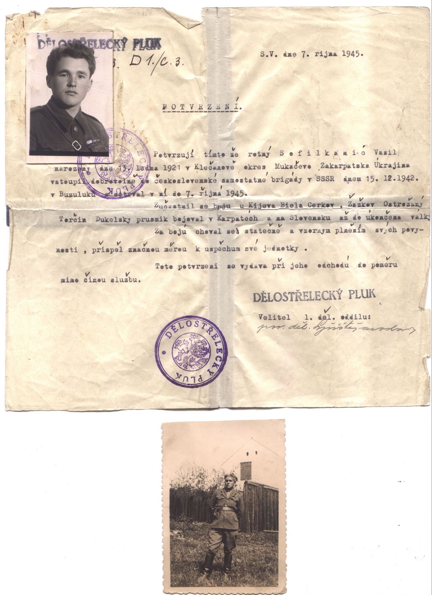 „V Mikuláši to bylo takhle: sovětská armáda Mikuláš osvobodila a československá armáda je měla vystřídat. Tak jsme se střídali, jenomže Němci to vytušili. A jak jsme se střídali, tak rychle zaútočili, a naše obrana ještě nebyla připravená. Kasárna byly osvobozeny. Oni honem zaútočili, vzali kasárna i nádraží v Mikuláši. Já měl natáhnout telefon (např. vzdálenost z Litic do Plzně). Tak táhnu telefon a přitáhnu ho na velitelství pluku. A velitel povídá, že Němci útočí. Poplach. A jak byl poplach, tak nikdo nesmí nikam. Já byl toho názoru, že tam zůstane u telefonu jeden a my se půjdeme podívat okolo, co je. A z toho nebylo nic. Tak jsem si povídal: ,Když to není dneska, tak to zítra bude.‘ To bylo ještě horší. Ten velitel zase, že je poplach. Dal mi takzvaný kulač. To je polní láhev ohnivé vody, abych si cucl. Tak jsem si cucl. A on povídá: ,Dej si ještě pořádně.‘ Teď vyjdu ven, to bylo ve škole, a koukám – on velitel praporu honí pěchotu, aby šla do obrany. A pěchota ustupuje. Jenomže za chvíli, když jsem se poděl, tak už tam nebylo nikde nikoho, pěchota prostě couvla dozadu. Teď koukám – on ten dvůr ze školy hraničil s Váhem. A tam v keři byl kanón 45 milimetrů protitankový, obsluha ho nechala a utekla. Rotmistr nějaký se s vojákem vrátili, vzali za lafety, a tak ho odtáhli pryč. Tak ustupujeme a ono to na okraj Mikuláše odtud z velitelství praporu bylo skoro na druhém konci. Jdeme, přejdeme na křižovatku na konci Mikuláše na Poprad. A tu křižovatku Němci už s kulometem tak řezali, k tomu ještě zápalnými, že bylo vidět, jak ty střely létají. Tak si povídám: ,Panebože, no co dělat?‘ Kdyby mě zabili, tak je mi to jedno. Ale poraní ti nohy, nebudeš moct jít a za chvíli přijdou Němci. A to bude: ,Jak se jmenuješ, odkud jsi, kolik je vás tam?‘ To byla samozřejmá věc, že se ptali, kdo je velitel a tak dále. Tak jsem si povídal: ,Panebože, to bych nechtěl zažít.‘ Tak jak tak koukám, tak si povídám: ,Ježišmarjá, vždyť my tu křižovatku můžeme obejít zahradami.‘ Tak jsme to obešli hezky. Ten Volyňák nesl radiostanici a já dva telefony. On chudák povídal ještě v Mikuláši, abych tu stanici vzal, abych mu ji pomohl nést. A já jsem mu povídal: ,Heleď, až budeme za Mikulášem, tak ji vezmu.‘ Když jsme táhli telefon do Mikuláše, tak na okraji Mikuláše byla sovětská pěchota, četa pěchoty. A když jsme se vrátili, tak už tam nebyla, nebyl tam nikdo. Vyjdeme ven z města a koukáme… takovou spoušť jsem neviděl za celou frontu. Předtím, ani potom už. Pozahazované pušky, pozahazované pláště. Teď jela auta, tu vyhodili ze silnice do pole, jak dostala ránu. A po silnici se už nedalo jít. Tak příkopem, sníh po kolena. A ten, to byl Volyňák: ,Vem to.‘ Já povídám: ,Zahoď ji. Já sotva lezu sám.‘ Ale nezahodil ji. Teď přijdeme do vsi, odkud jsme vyšli s telefonem. A tady najednou: ,Stůj! Kdo tam?‘ A sovětský důstojník… ,Běž do obrany!‘ A za námi nikdo a před námi taky nikdo. Tak jsem si umodlil, že jsme telefonisti a že potřebujeme navázat spojení s oddílem.“