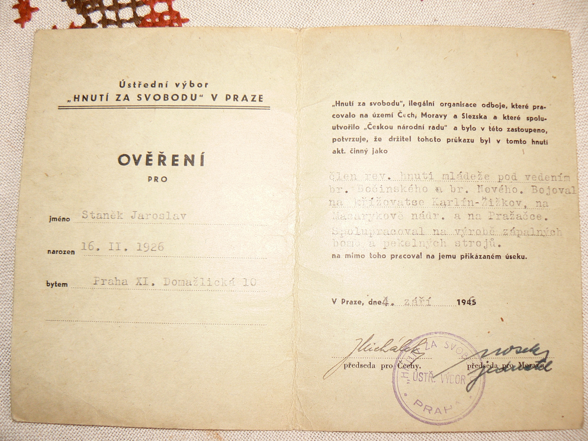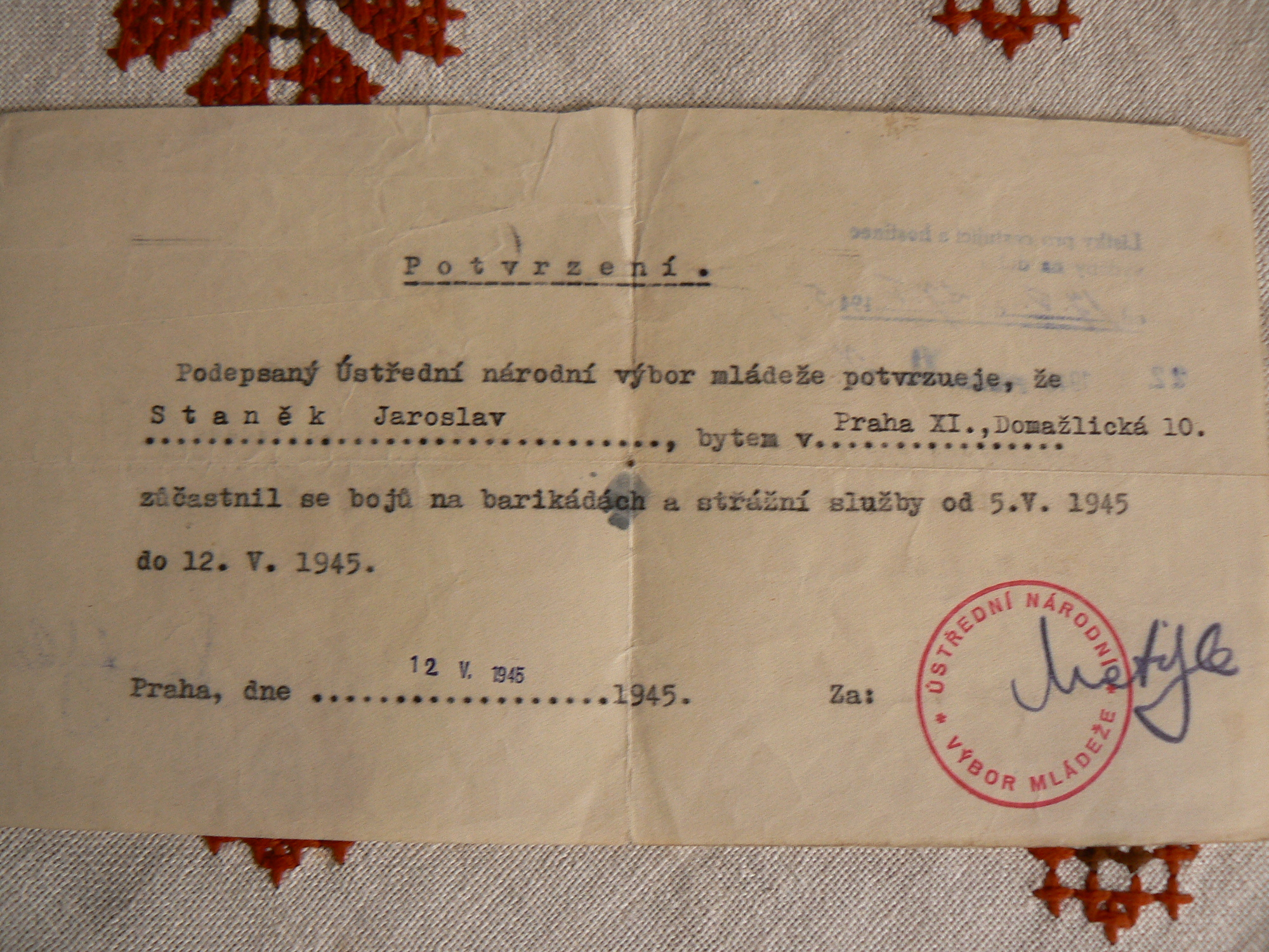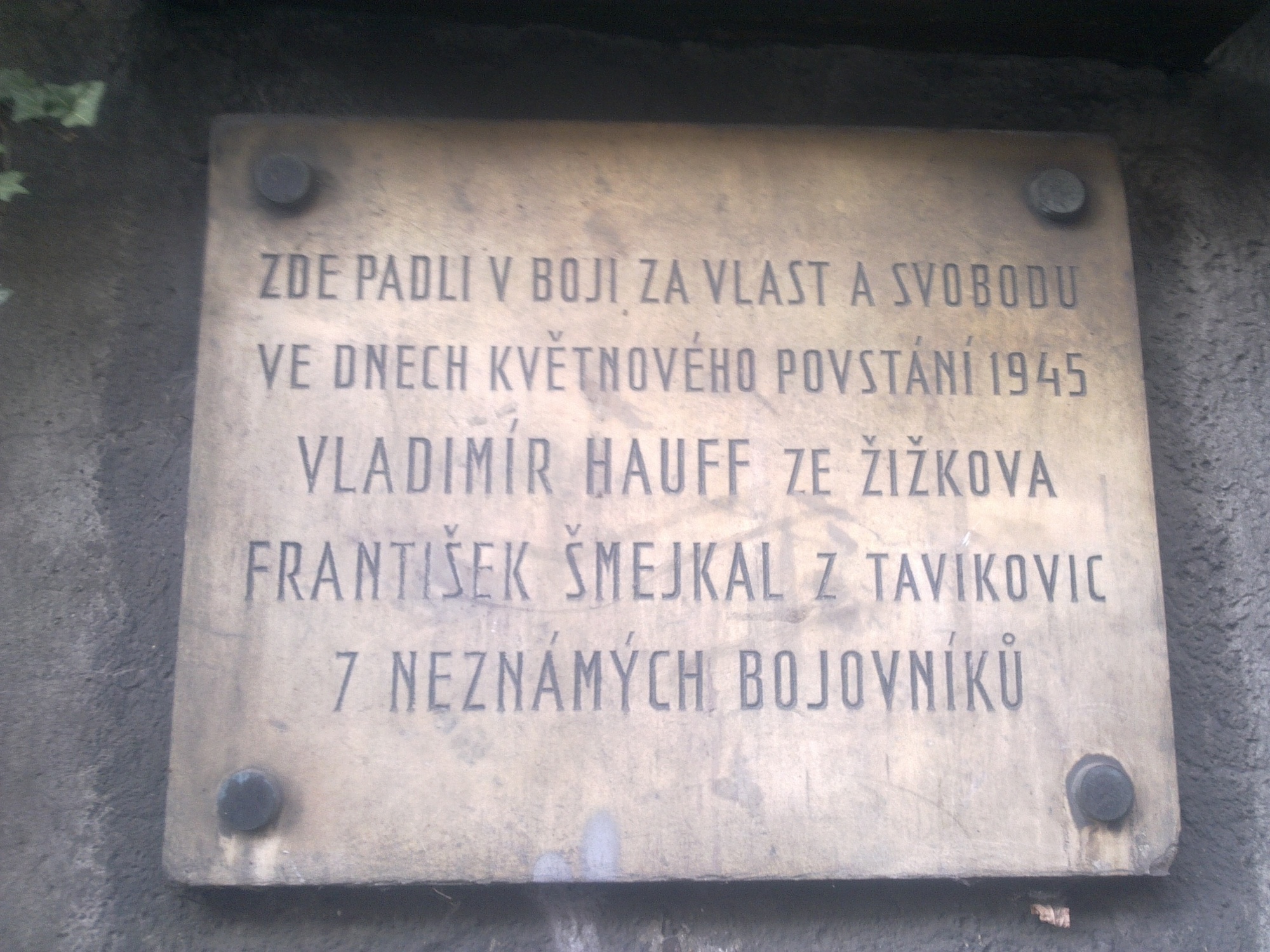 „Byli jsme na barikádě na Žižkově. Končila mi zrovna služba, tak jsem předával pušku Otovi Košťálovi, kterému se říkalo Grizzly. Poručík nám povídá: ,Tři dobrovolníci na barikádu, zaházejte průchod.‘ Díval se přitom na mne. Tak jsem se přihlásil, se mnou Vladimír Hauff a nějaký pán. Zahazovali jsme průchod a vtom začala střelba. Poručík na nás volal: ,Po jednom zpátky za barikádu!‘ První, který byl nejblíž, přelezl a nic se nestalo. Poručík řval: ,Další!‘ Stejně daleko od ní jsme stáli já i kamarád Vladimír Hauff. Vyrazili jsme stejně, jenže protože já byl vždycky hrouda a on sportovec, doběhl tam dřív. Když byl na hřebenu barikády, tak začala střelba. Volal jsem na něj, ať sleze dolů, myslel jsem, že se chce ve zmatku krýt. On tam zůstal ležet. Já ani nevím, jak jsem skočil za barikádu. Sundali jsme ho, měl čistý průstřel krku.“