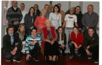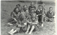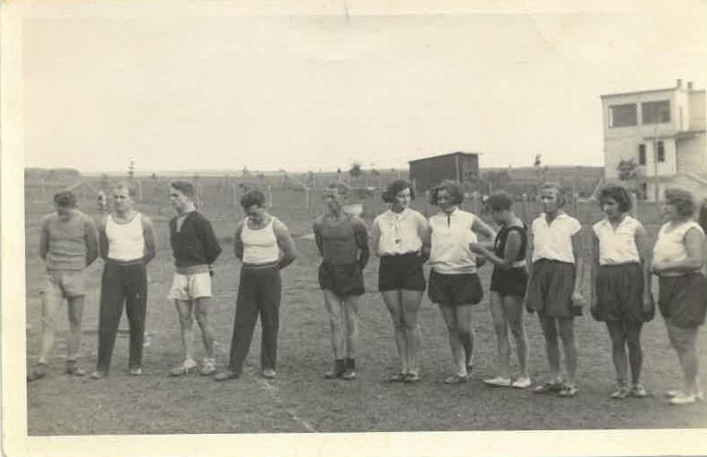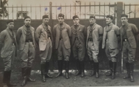 Přátelé Blaženy Strachotové a živnostníci ve Slavičíně v sokolském, zleva František Maláník (autodopravce), František Trčálek (kovář), Josef Málek (sedlák a zvěroklestič), Ludvík Malíček (sedlák a kolař), Karel Vystrčil (učitel), Rudolf Jurek (majitel sodovkárny), Arnošt Zdráhal (malíř), Josef Kobělský