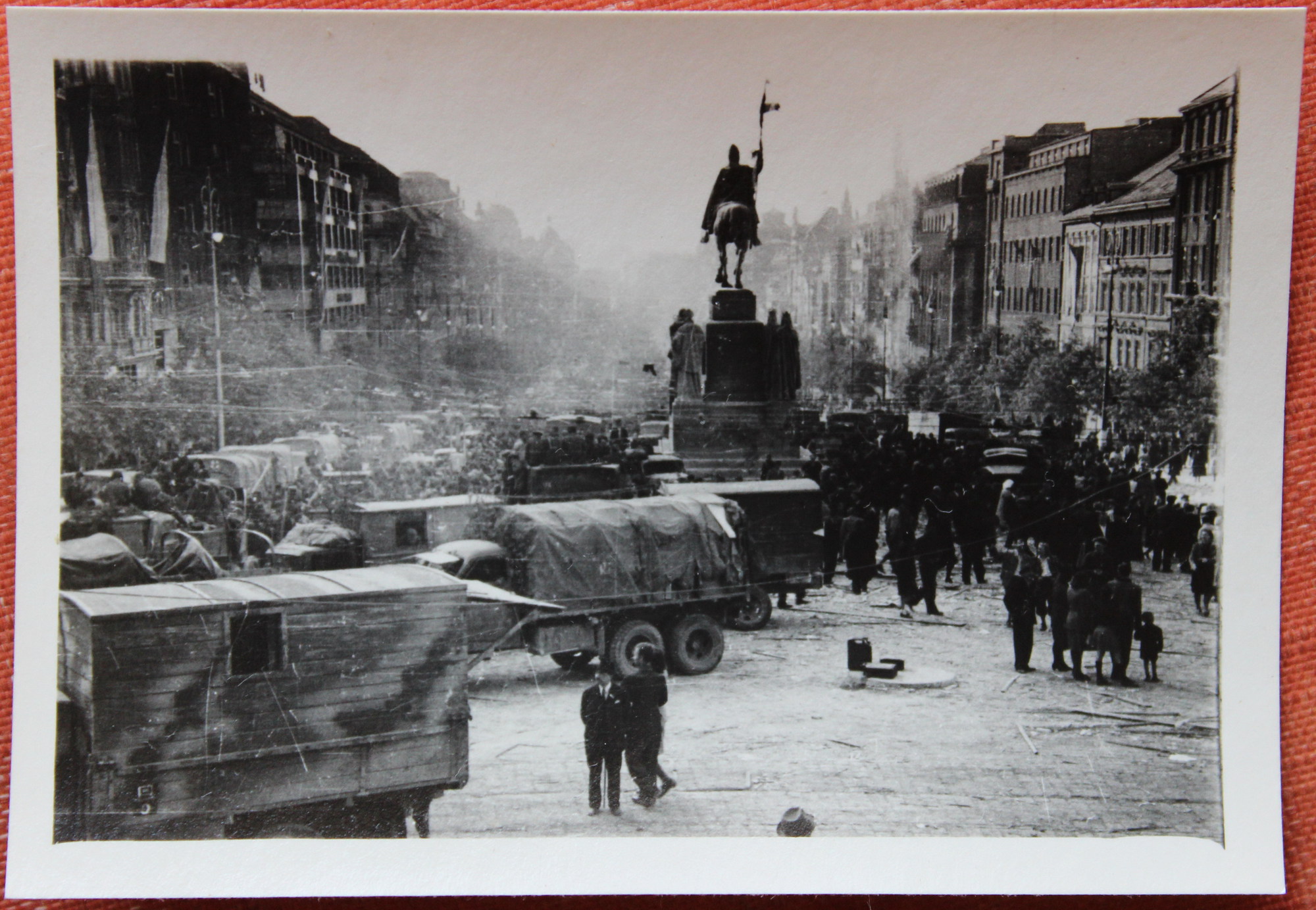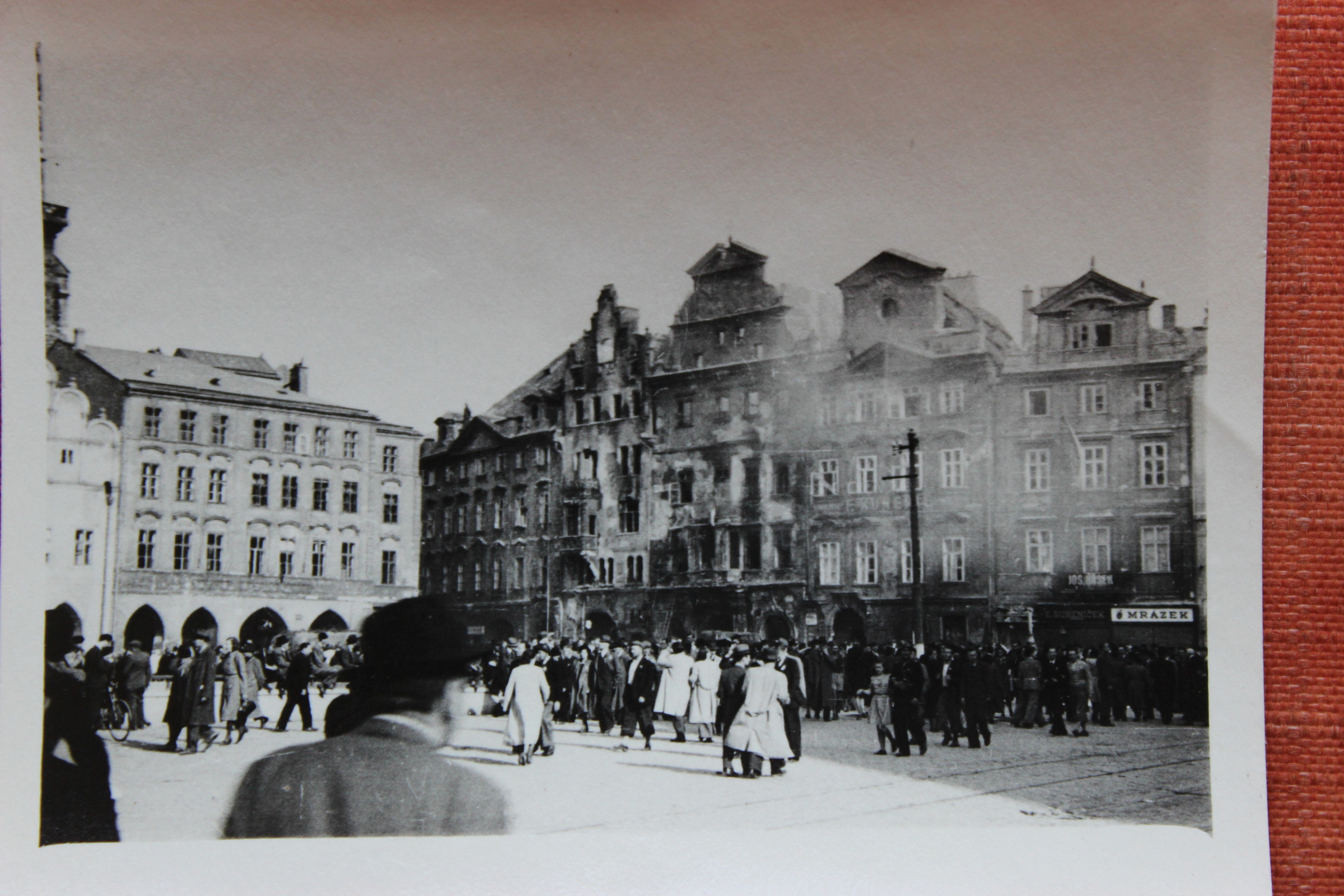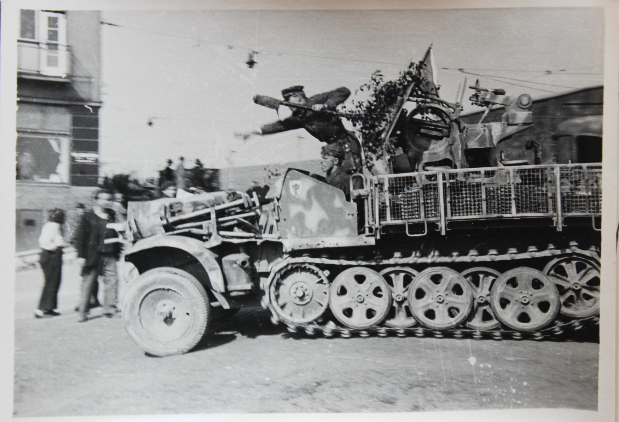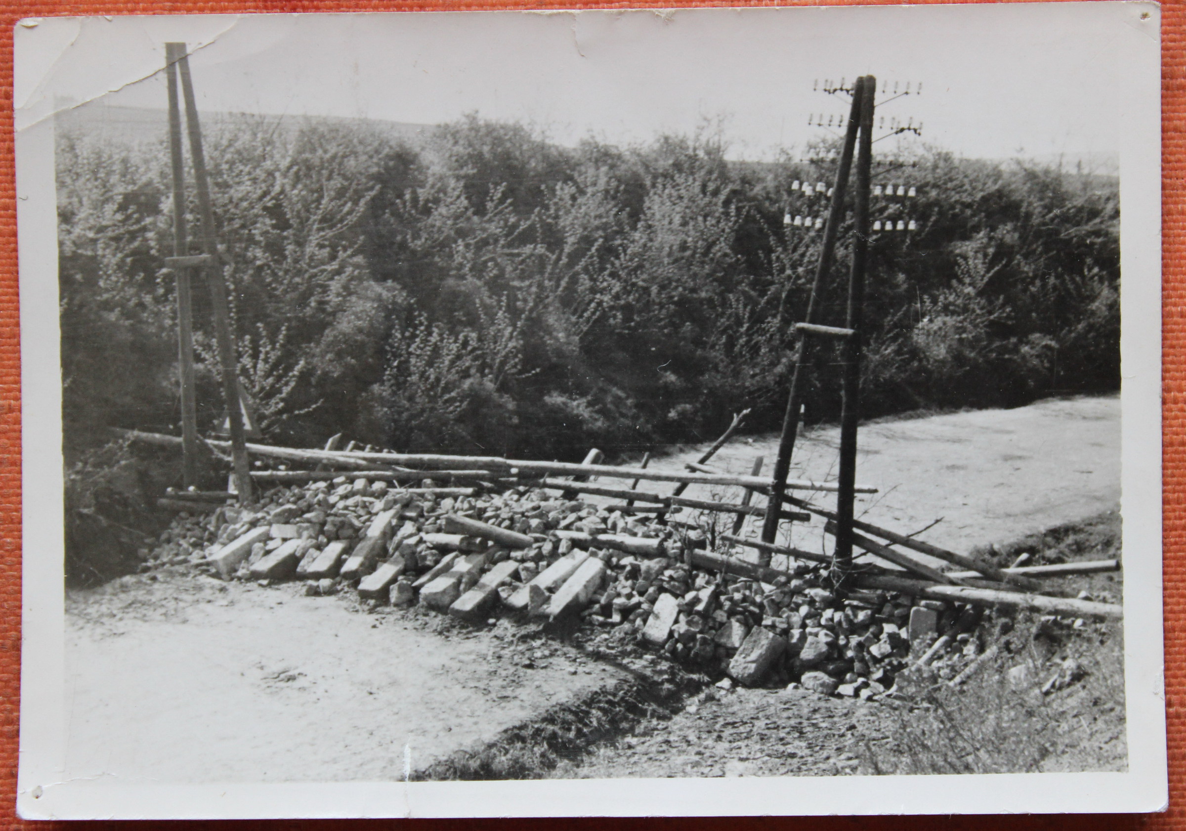 „V koši nese jim jídlo, a to je tam na tu Horoměřickou, já jsem si to tam připsala, kam to nesou. Tam byla barikáda, protože se báli Němců, kteří byli ubytovaní tady dole, co je tam takový zámeček (Jenerálka). Chystali se do Prahy. To už byly špatné zkušenosti s tím, co tady prováděli Němci. Teď si nevzpomenu, kde všude… Hnali lidi před tanky. Tak tam měla ta barikáda zabránit Němcům, co tam byli ubytovaní, ke vstupu do města. (Tu fotku jste pořídila vy, nebo otec?) (…) Jak jsem říkala, my jsme fotografovali všichni tři. Já, manžel a otec.“