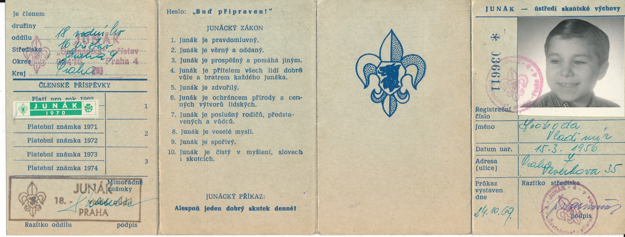 Vladimír Svoboda se narodil 15. března 1956 v Praze. Jeho otec Jaroslav Svoboda pocházel z pražského rodu živnostníků, po roce 1948 pracoval v holešovické tiskárně cenin. Matka Eva, rozená Dobiášová, rodinu roku 1961 opustila a Vladimír ani její bratr se s ní nevídali. Později Vladimír vyrůstal s nevlastní matkou. V druhé polovině 60. let se stal člen 18. oddílu vodních skautů, jezdil na skautské výpravy a tábory. 25. ledna 1969 se s otcem zúčastnil pohřebního průvodu k uctění Jana Palacha. Když ho míjel smuteční průvod s rakví a státními symboly, zvedl ruku ve skautském pozdravu. Tento moment zachytil fotograf Miloň Novotný na snímku, který zveřejnilo mnoho časopisů a stal se symbolem onoho tíživého okamžiku. Skautský oddíl byl roku 1970 rozpuštěn, ještě chvíli pokračoval v činnosti pod záštitou TJ Sparta. Později se Vladimír věnoval vodáctví v oddílu Zlatá kotva pod hlavičkou Socialistického svazu mládeže (SSM). Po absolvování základní školy se vyučil tiskařem a po vojenské službě vystudoval střední grafickou školu v Hellichově ulici. Roku 1978 se oženil a narodily se mu dvě děti (1980 a 1982). Do roku 1991 pracoval v holešovické tiskárně cenin, v letech 1991–2005 sám podnikal jako tiskař, poté pracoval v tiskárně ve Vestci. Po roce 1989 se již ve skautingu neangažoval, do skautských oddílů se však zapojily jeho děti a později i jeho vnoučata. Identitu „chlapce na fotografii“ vypátrali v roce 2019 s pomocí veřejné výzvy členové Junáka a Skautského institutu.