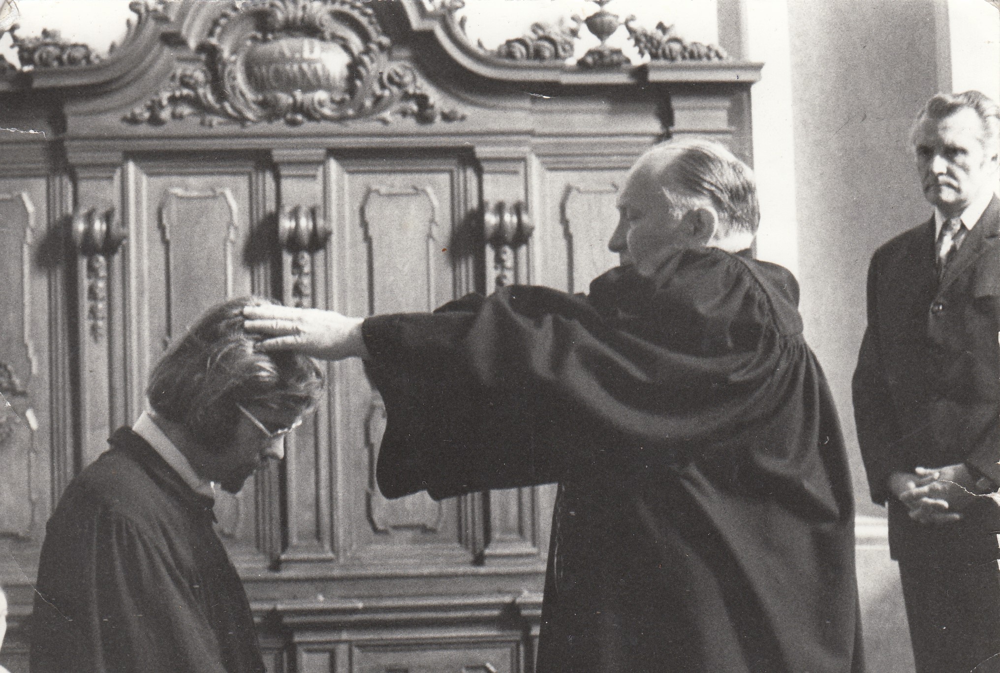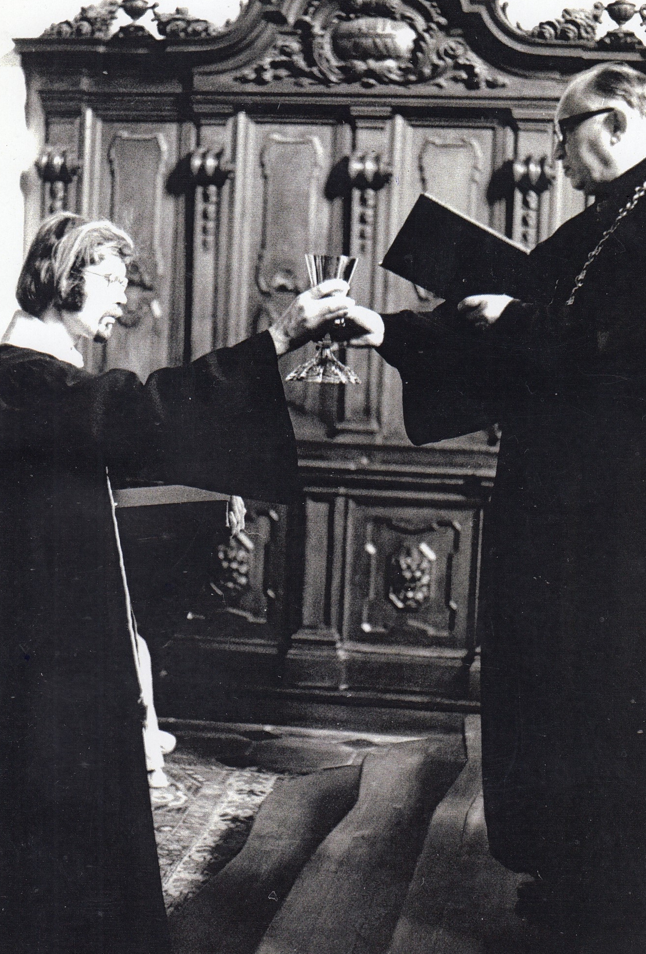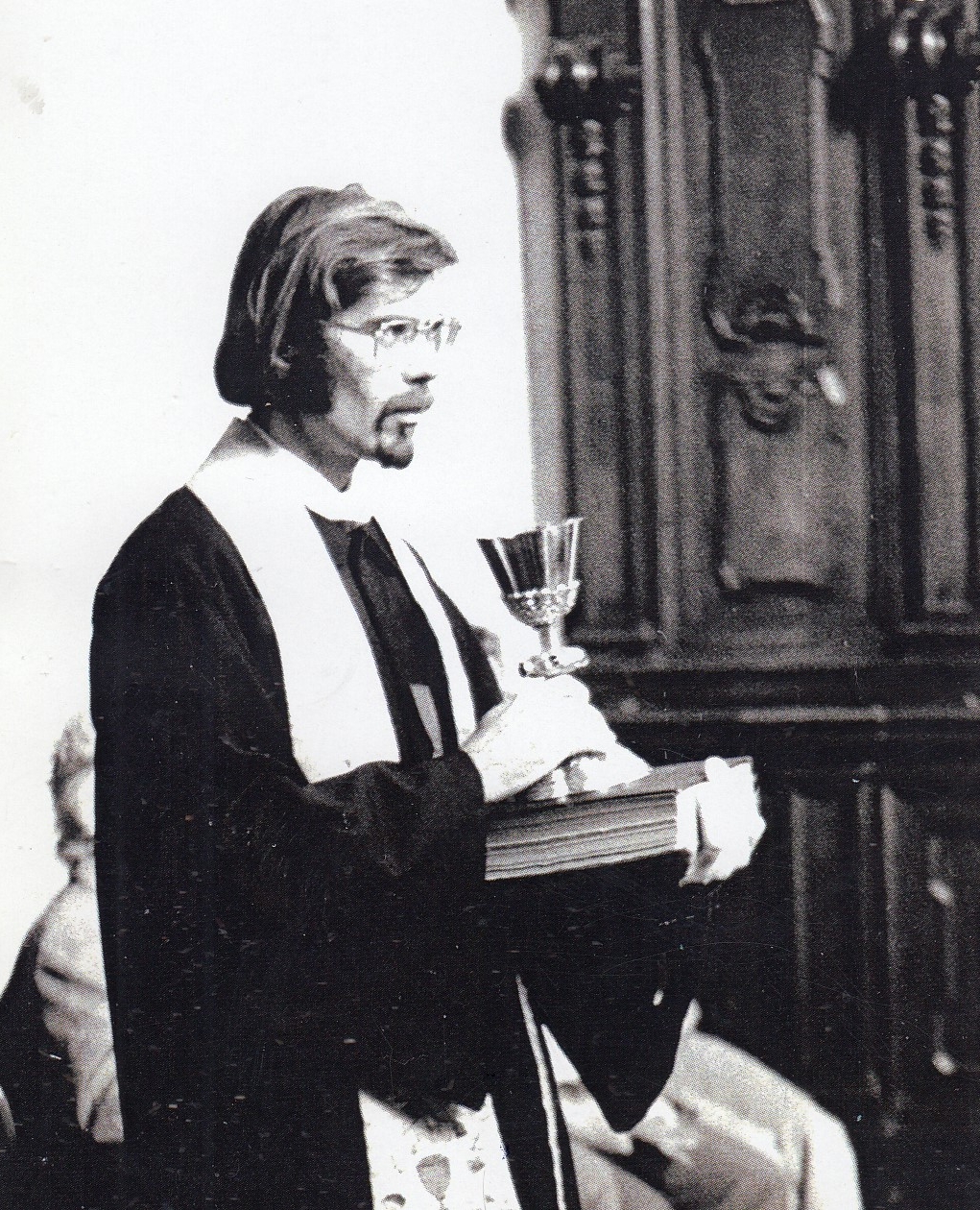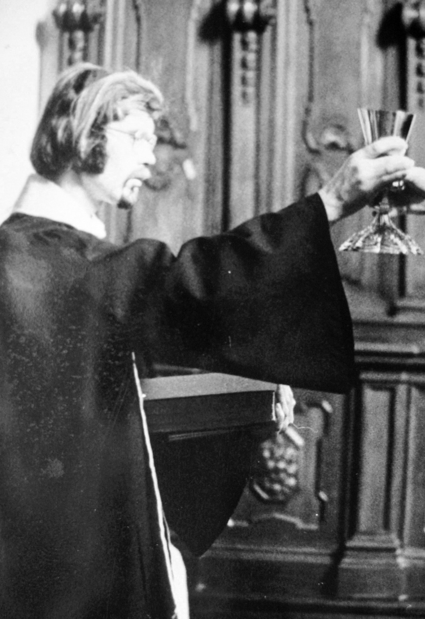 „Cesty Boží jsou nevyzpytatelné a já jsem se rozhodl, že z fakulty odejdu. Tak jsem tak zoufale bloudil Prahou. Na Strossmayerově náměstí u katolického kostela byla vývěska, u které jsem se zastavil, a čtu asi toto: ‚Je-li něco v církvi, co způsobí, že bys chtěl z církve odejít, tak viz, že jenom Bůh má v ruce bič a soud, a ty se snaž být nádobou zlatou nebo stříbrnou, a ne hliněnou, která bude rozbita.‘ To je někde ze Starého zákona. V té situaci to byla odpověď na moje tázání a zoufání. Rozsvítilo se mi, opravdu rozsvítilo, a řekl jsem si: 'No co by bylo, kdyby všichni odešli, tak co by bylo? Tak ty se snaž být tou nádobou stříbrnou a ten soud je v rukou Božích. Ty máš jediný úkol, aby ses snažil obstát při tom soudu.' Tak jsem se začal usmívat a pokračoval jsem dál.“