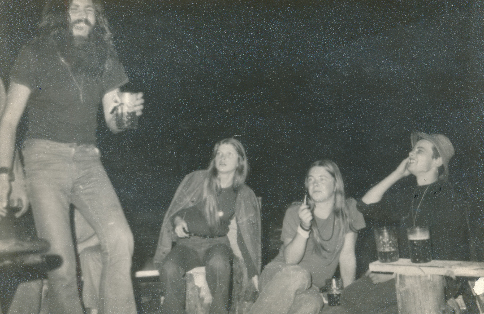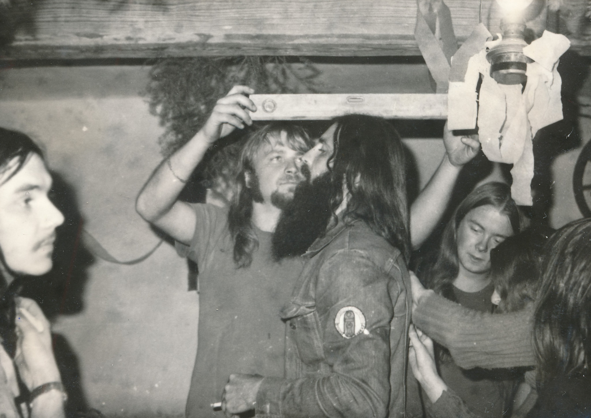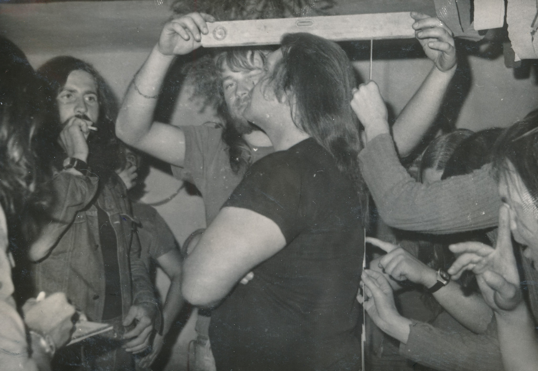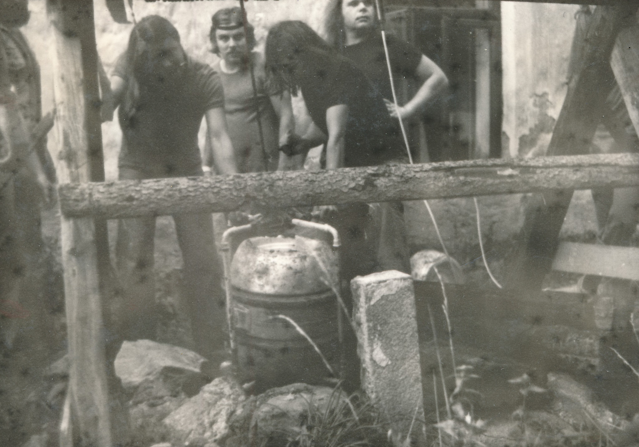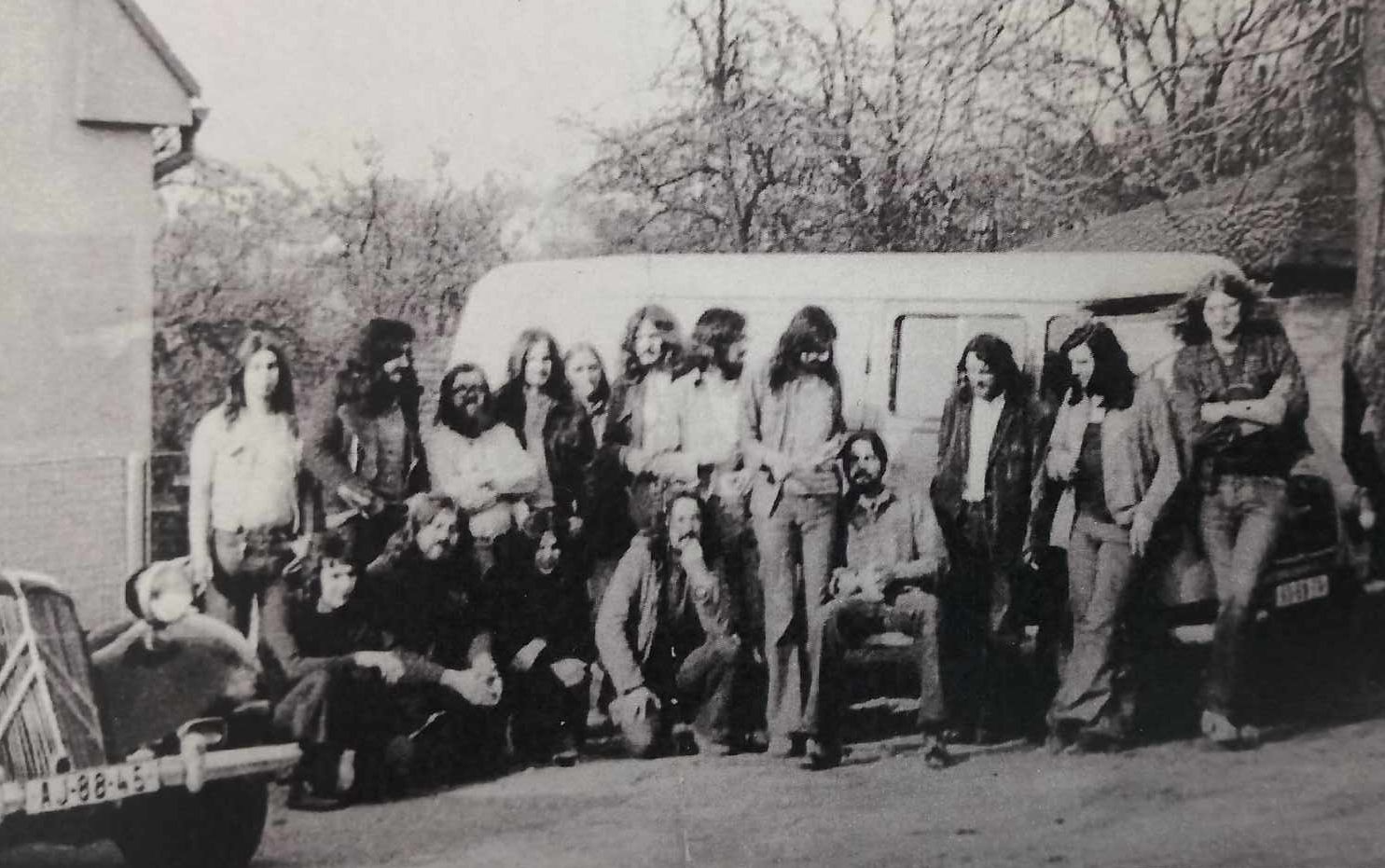 Vlastimil Vincenec (sedící na židli) se skupinou Adept a s dalšími účastníky koncertu Na Americe, 29. března 1974, Rudolfov u Českých Budějovic