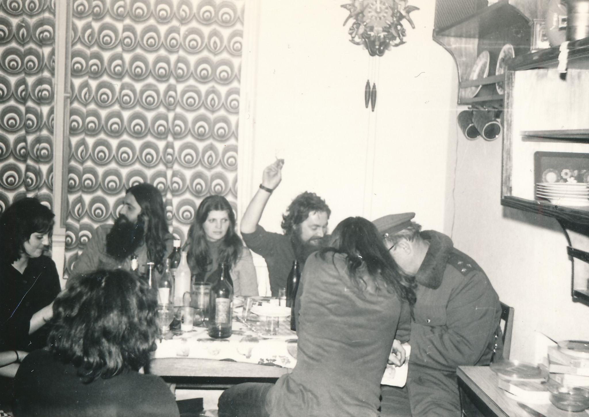 Vlastimil Vincenec (uprostřed) s manželkou Jiřinou Vincenecovou v hospodě U Betlémské kaple, 2. pol. 70. let, Praha