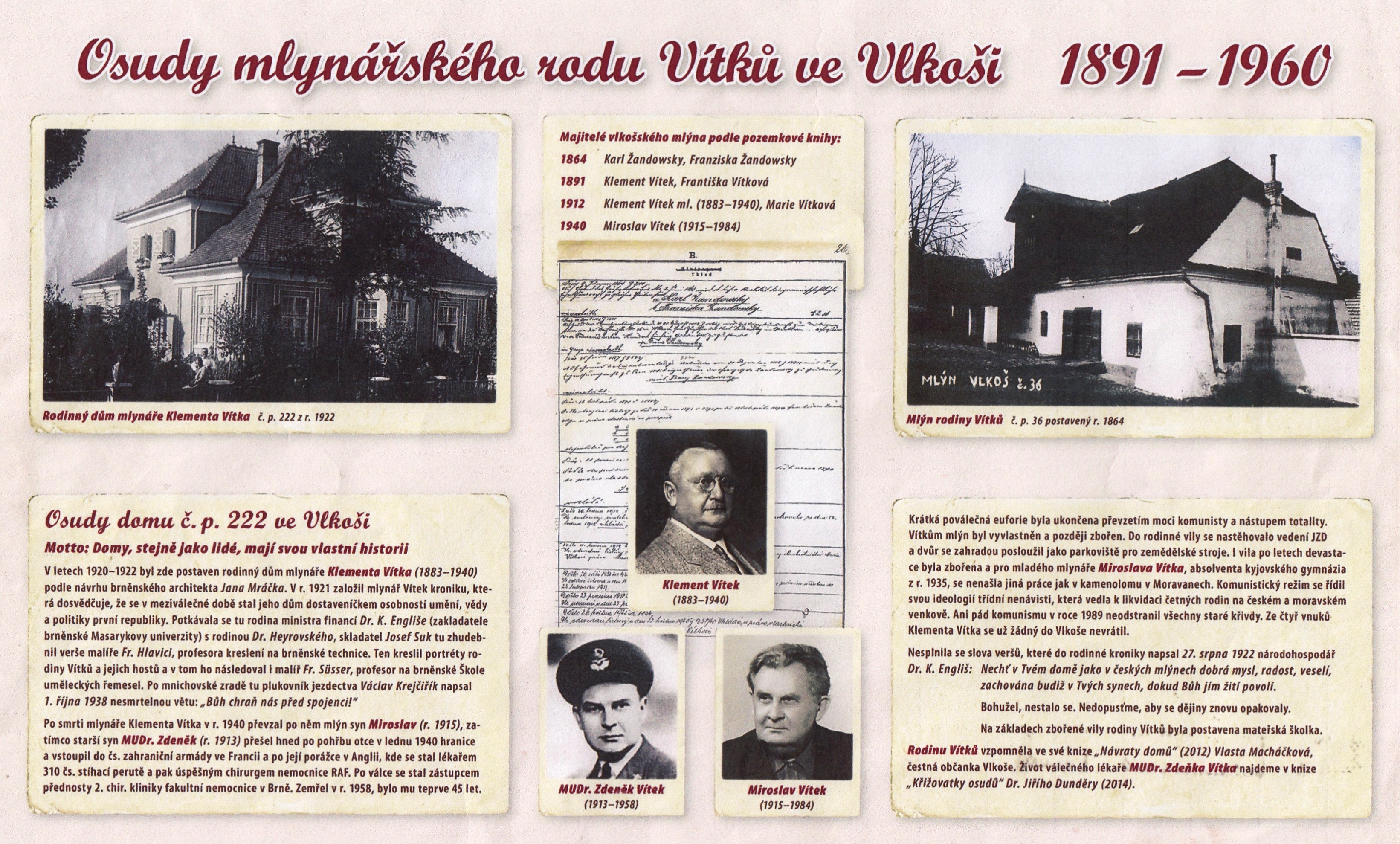Miroslav Vítek se narodil 7. října 1943 v rodině mlynáře ve Vlkoši u Kyjova. Jeho strýc Zdeněk Vítek byl za války lékařem příslušníků RAF v Anglii. Po únoru 1948 komunisté rodině zabrali mlýn, pálenici a další hospodářské budovy. Do rodinného domu nastěhovali nájemníky, v dalších místnostech si JZD zřídilo kanceláře. Pamětník byl svědkem opakovaných návštěv StB. Jeho otec byl krátce vězněn v Uherském Hradišti, pak musel pracovat v kamenolomu. Rodina byla donucena se z Vlkoše vystěhovat. Mlýn ze druhé poloviny 19. století byl zbořen, rodinná vila rozebrána a přestavěna na mateřskou školu. Po roce 1989 dostali Vítkovi za část zabaveného majetku odškodné.