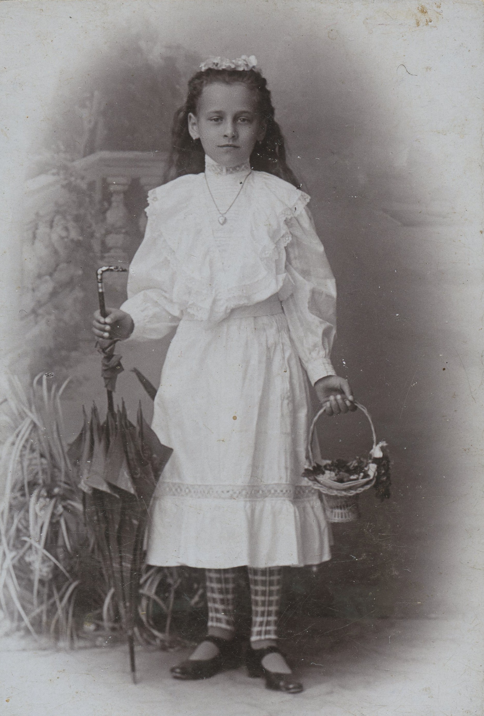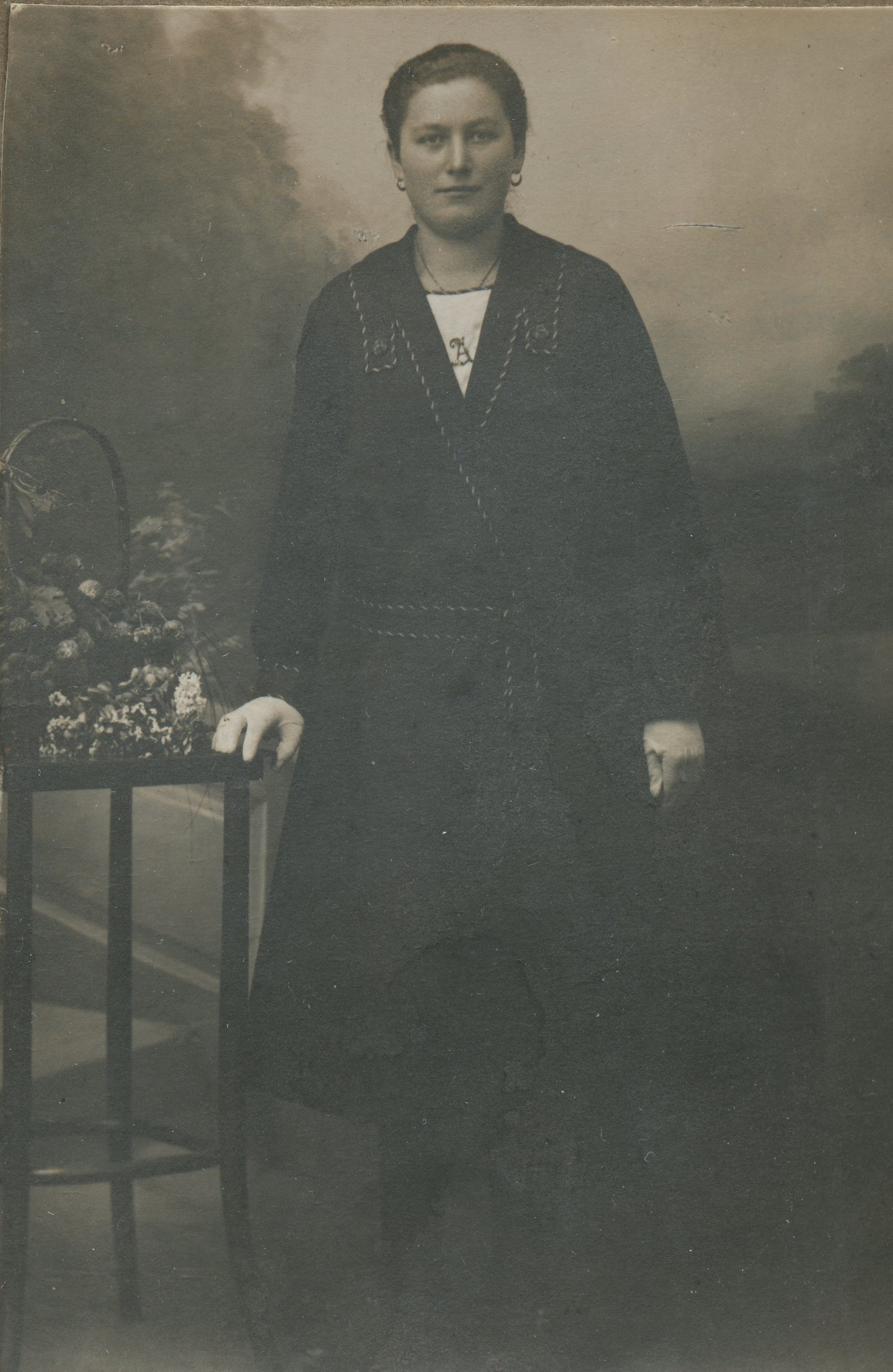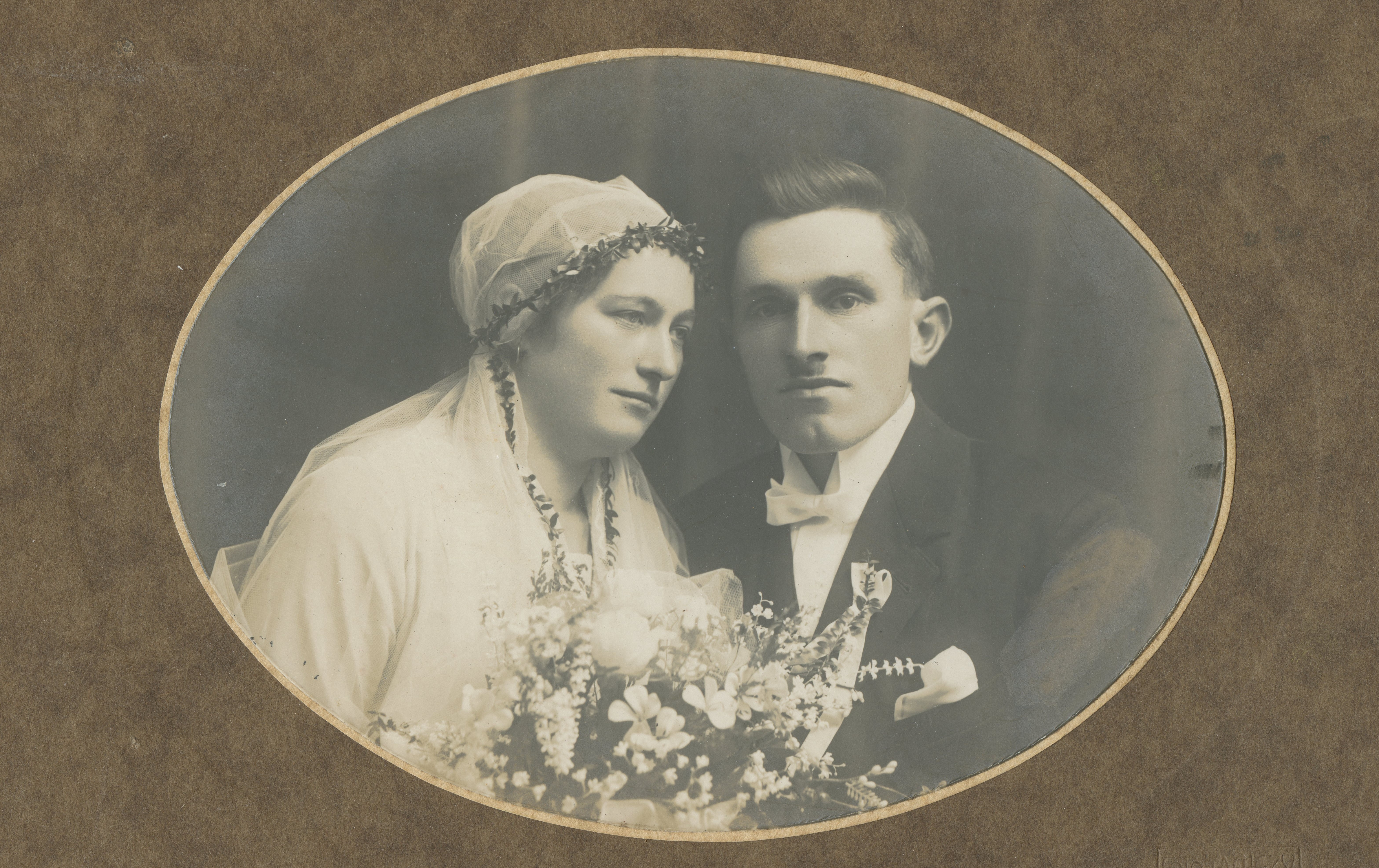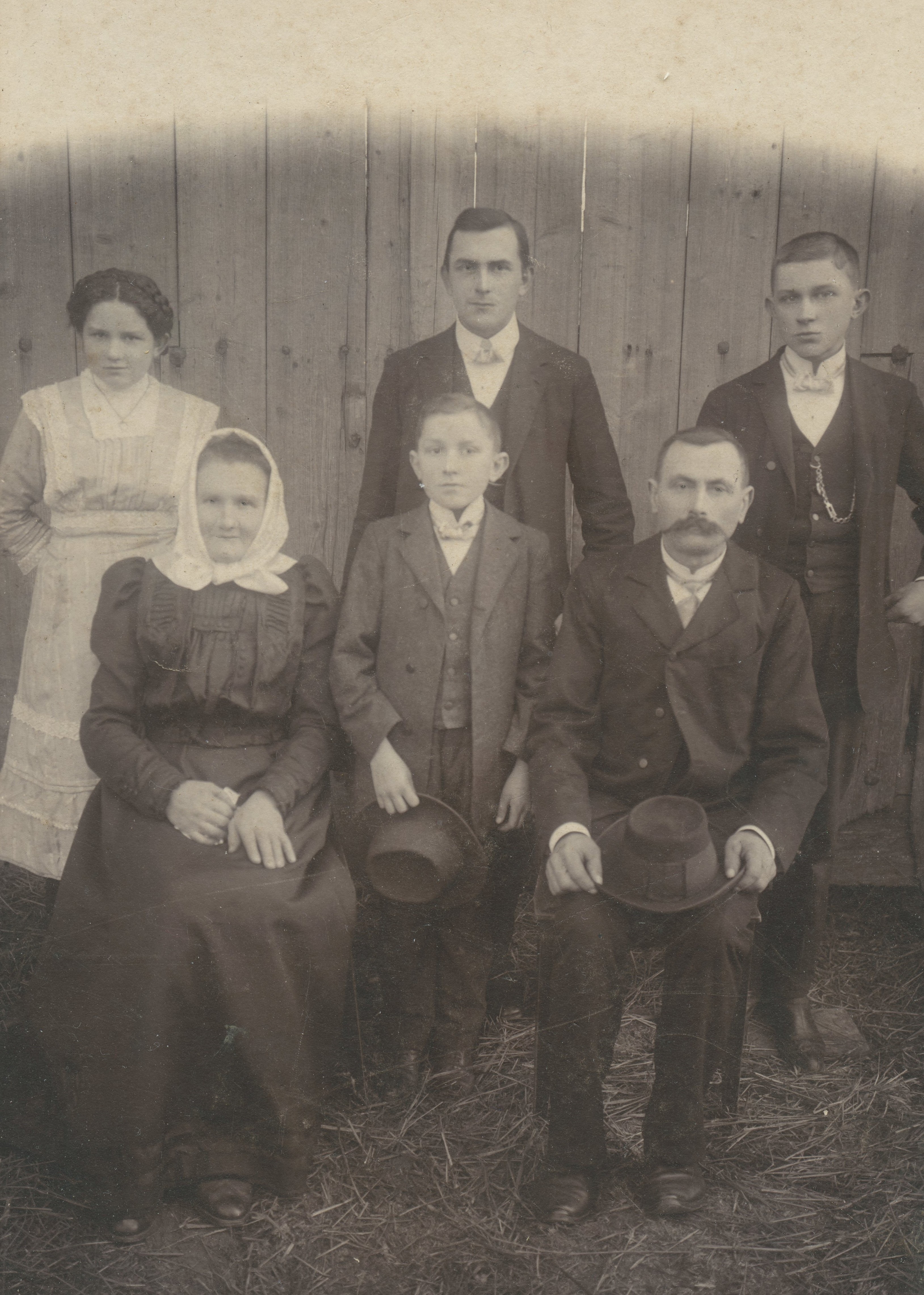 Svatba Anny a Josefa Vopařilových, zleva Josef Vopařil, Kosinová (z Makova z Kaupova baráku, co postavil Jan Kovář), Václav Abrham z Makova, kostelník Josef Svatoš, Anna Svatošová (rozená Vašková z Proseče), Kristýna Vopařilová (rozená Sýkorová)
