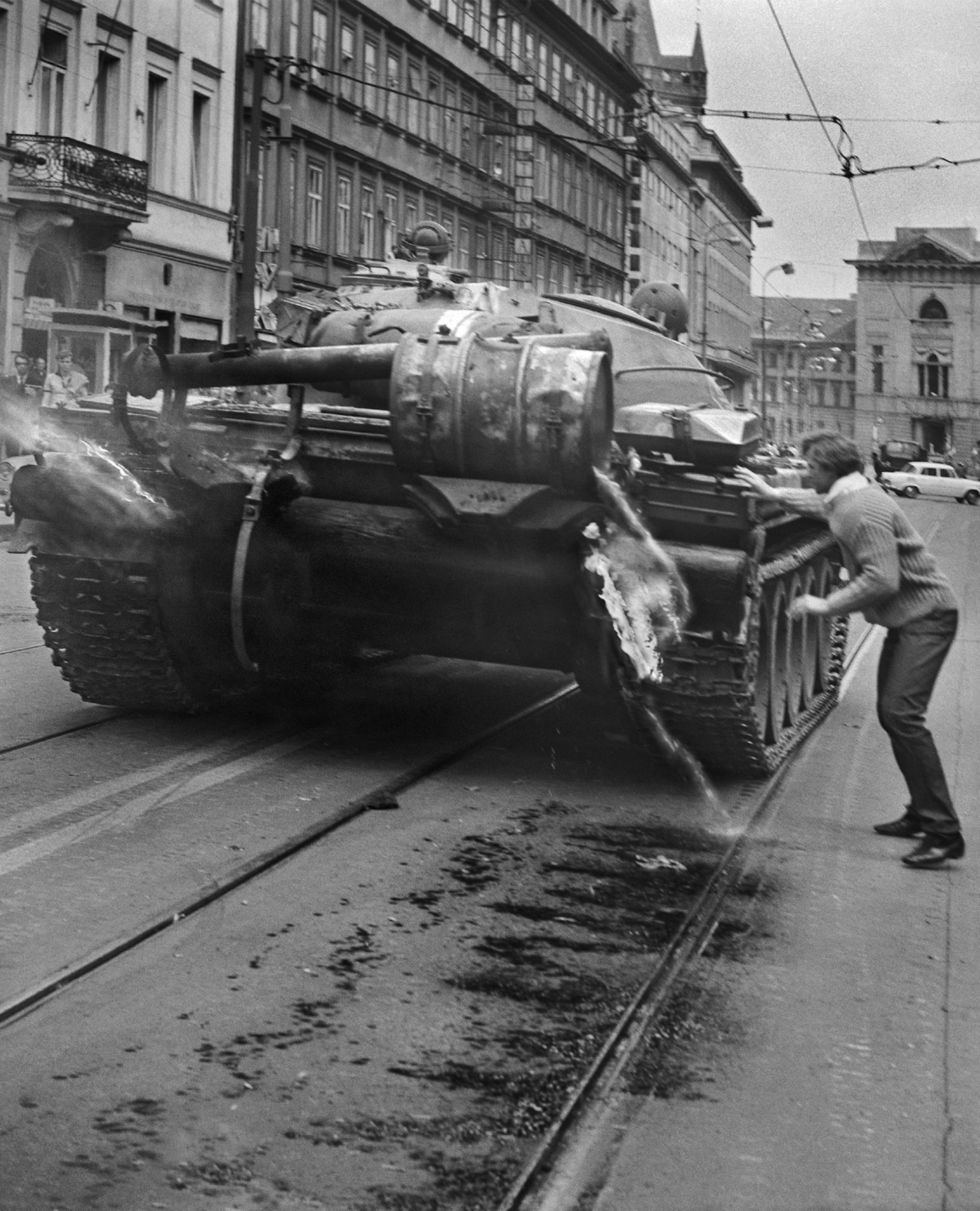 • „Léto 1968 jsme s rodinou trávili na Slovensku. Poslouchal jsem Svobodnou Evropu a řekl jsem si, že se musím vrátit do Prahy. Přijel jsem včas, ještě před 21. srpnem. Protože jsem bydlel na Červeném vrchu, tak jsem měl výhled na přijíždějící sovětské vojáky z první ruky. A jako mladý blázen jsem šel na Hrad mezi ně. Fotografoval jsem velkým foťákem, praktisixem s velkým teleobjektivem, a Rusům to samozřejmě vadilo. Narvali mi hlavně samopalů do břicha a: ,Davaj pljonku!‘ Když máte odjištěné samopaly na břichu, není to vůbec jednoduché. Tak jsem jim film dal. Potom jsem šel k ústřednímu výboru. Tam jsem pořídil pár fotek a následně jsem vyrazil na Vinohrady. Tam se mi podařilo nafotit snímky, které byly poměrně hojně publikovány. Snad nejznámější a podle mě nejlepší je ten, kde jsou hořící Vinohrady, sovětský tank, za ním bouchají muniční vozy a před tím tankem běží kluk, který má v rukou rádio. Je to symbolické, že jsme měli jenom holé ruce a rádio. Po vysoké škole, když jsem byl na vojně, tak jsem sloužil jako tankista. Tak když se rozbíjely nádrže a zapalovaly a tanky mohly bouchnout, tak to nebylo vůbec nic příjemného. Tím ty mladé Rusy neomlouvám, neměli střílet, ale bylo to na ně velké napětí. Podle mého názoru vůbec nevěděli, kde jsou, proč tu jsou. Proto se děly strašný věci a velitelé to nezvládli. Rusové stříleli i na Muzeum, protože si jej pletli s rozhlasem. Tam jsem taky byl a mám odtud ještě malou nábojnici. Když jsem fotil, lidi mě strhli na zem, abych to nekoupil. Byl jsem rád, že jsem to přežil. Myslím si, že první tři hodiny na Vinohradech byly velice emotivní. To byla skutečná okupace, opravdu ošklivá, když se bojovalo o rozhlas.“