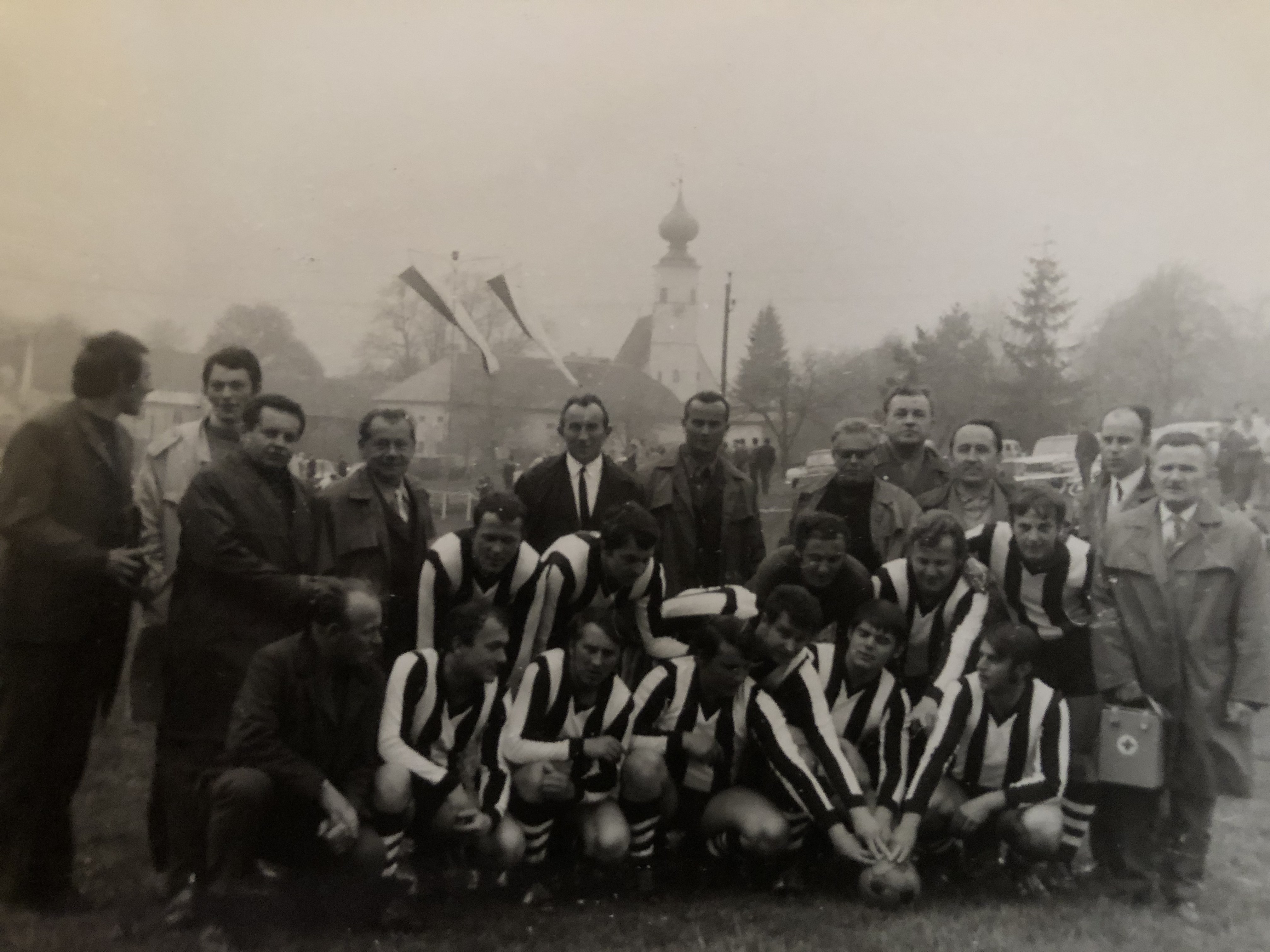 Hromadná fotografie fotbalistů z Ondřejova u příležitosti přátelského klání mezi Ondřejovem a nejmenovaným rakouským mančaftem, Václav Vycpálek v horní řadě s bílou košilí a kravatou, 1970