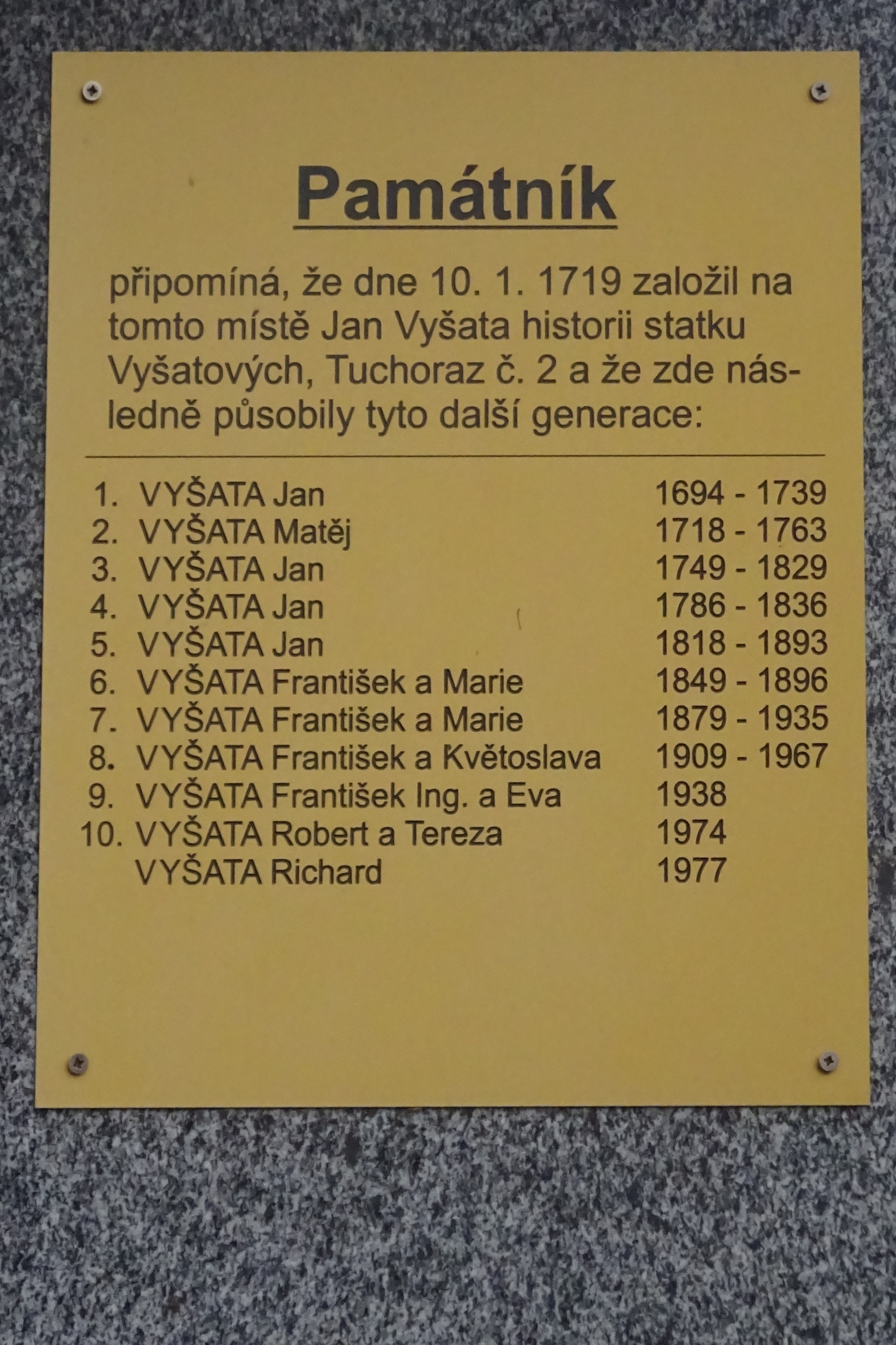 František Vyšata se narodil 23. ledna 1938. Vyrůstal ve středočeské obci Tuchoraz, kde jeho rodina už 400 let hospodařila na velkém statku. O hospodářství rodina během kolektivizace přišla, pamětníkův otec skončil ve vězení a Františka provázelo v letech komunistického režimu stigma syna kulaka. Útěchu hledal ve sportu. Vystudoval Vysokou školu chemicko-technologickou. Po srpnové okupaci roku 1968 se mu rozpadlo manželství, manželka Olga s dcerou emigrovaly do USA. Po roce 1989 se František zasloužil o záchranu ovocných sadů v rodné Tuchorazi, později koupil i tamní tvrz, na které v době natáčení rozhovoru (2019) pořádal společenské a kulturní akce.