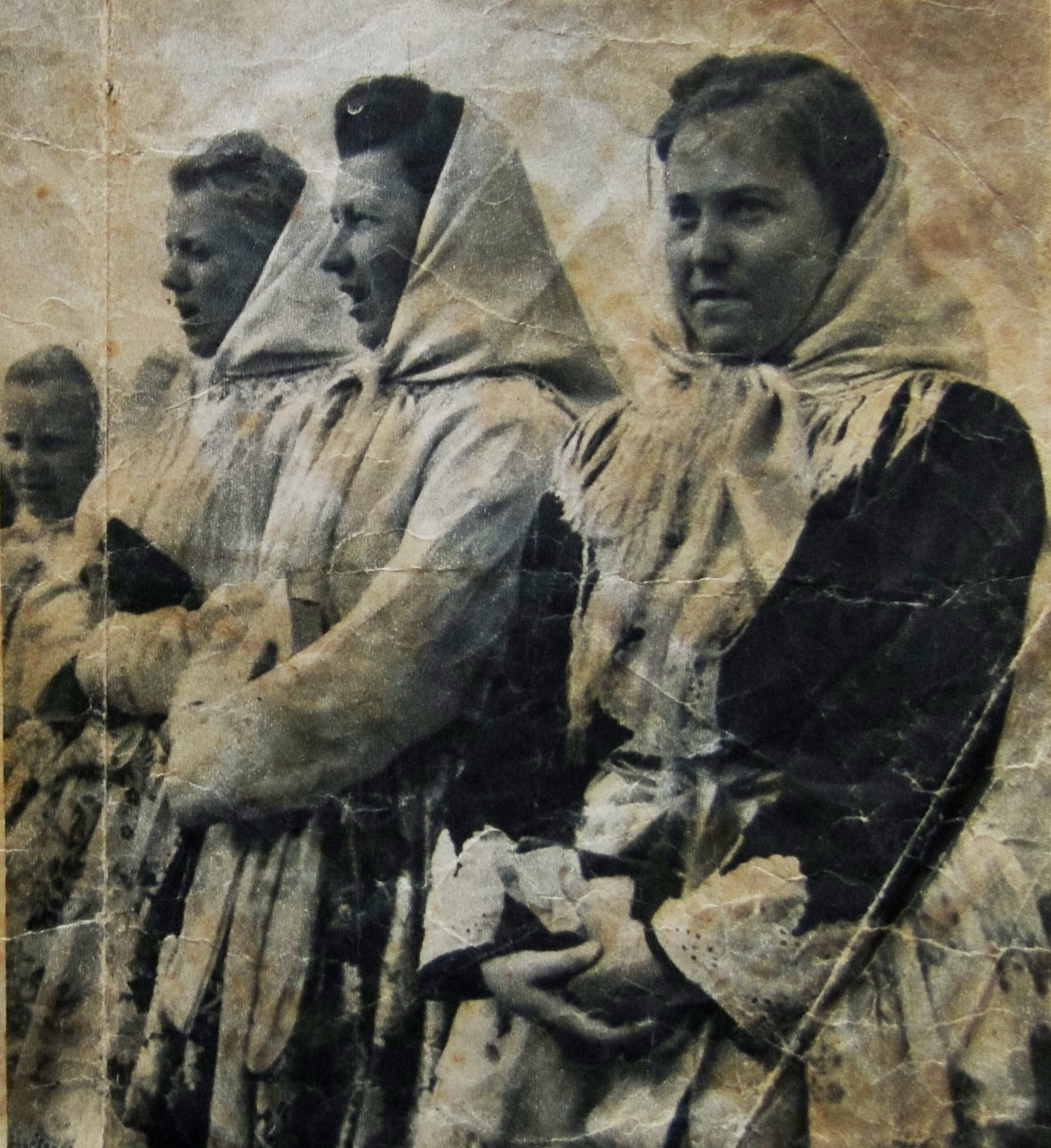 Vystoupení Mariánské družiny u příležitosti konání poutě na svatý Antonínek; pamětnice druhá zleva, první zleva její sestra Františka; fotografie součástí článku v regionálních novinách; Blatnice; 2. polovina 40. let