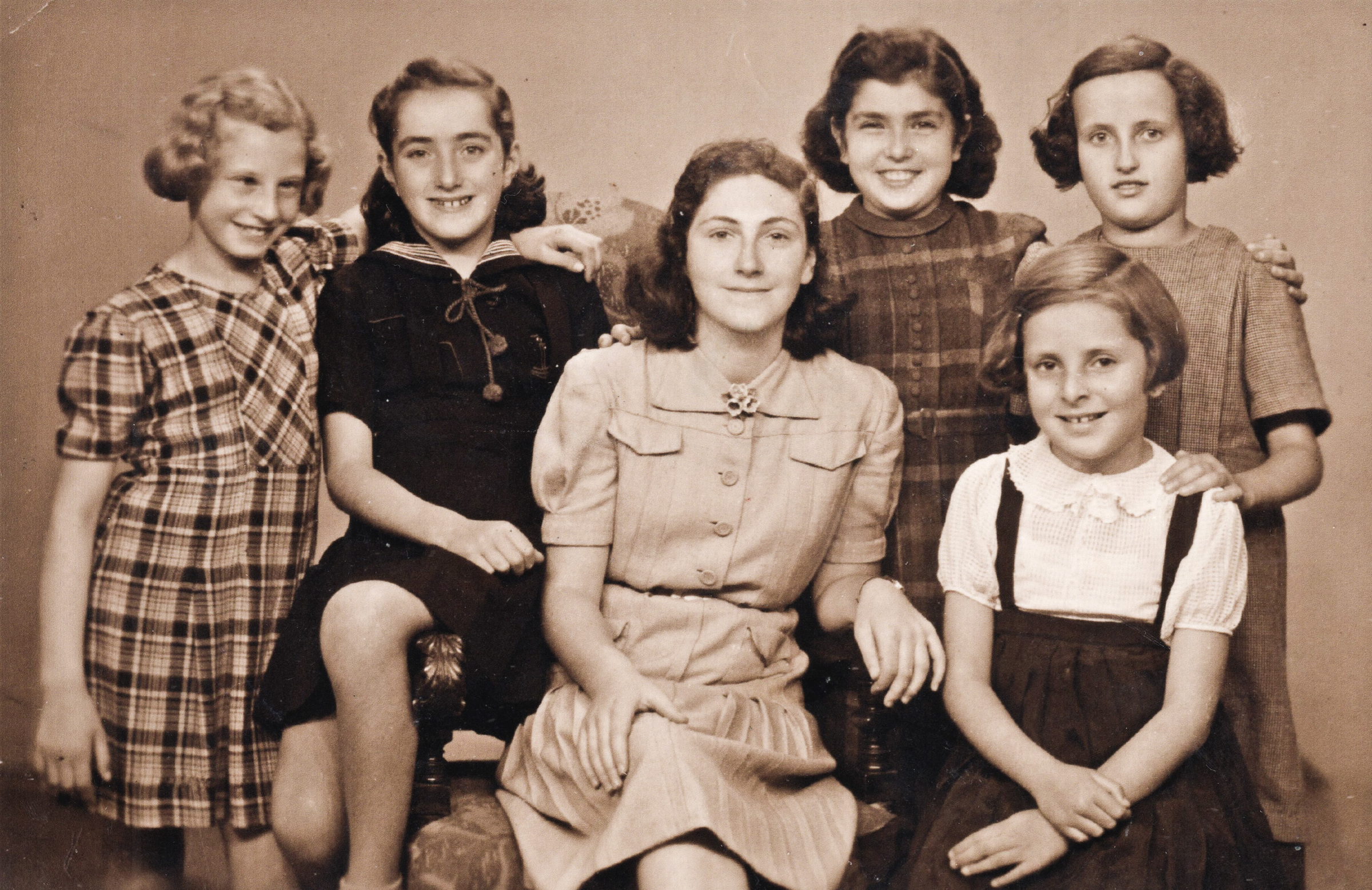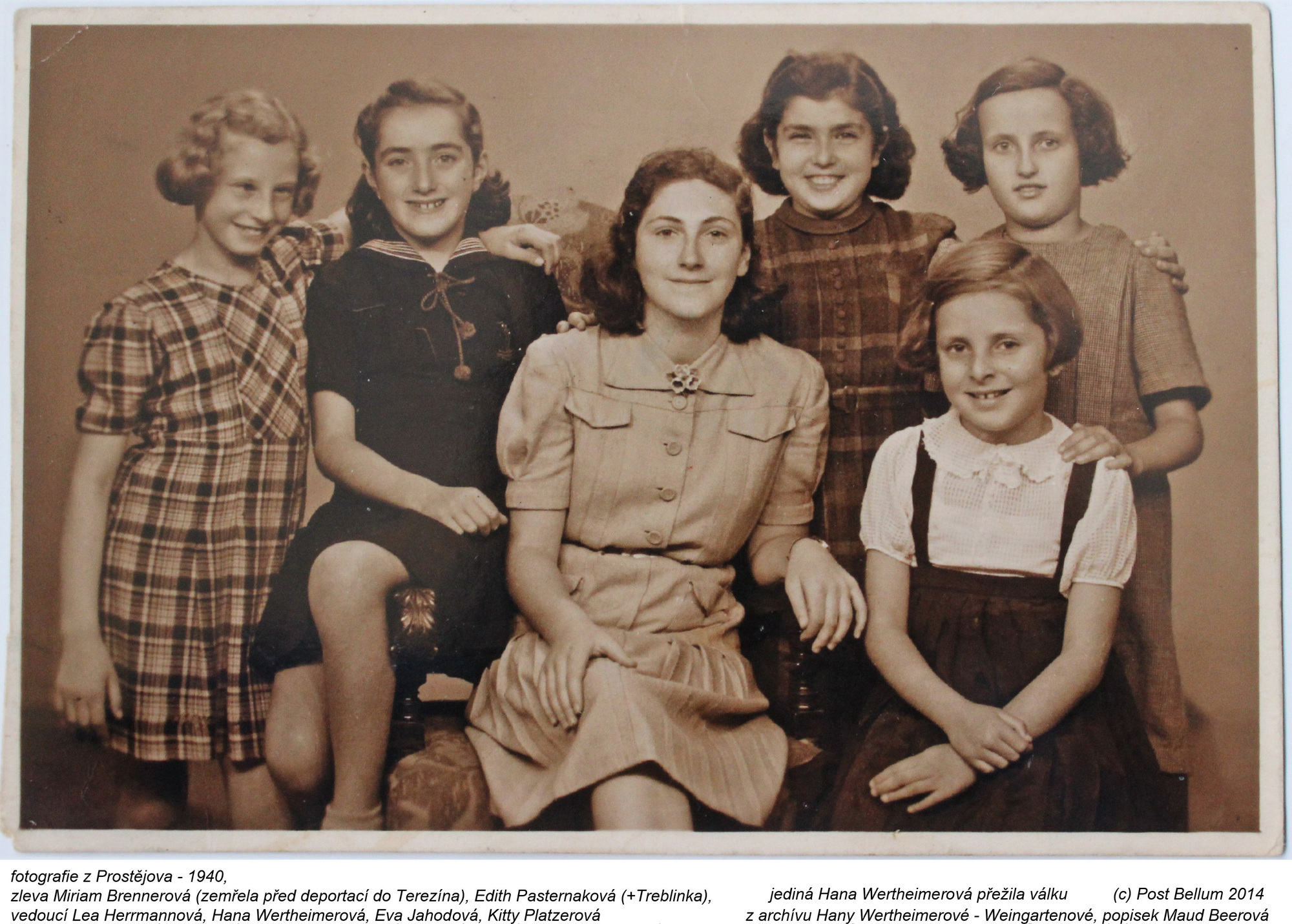 Fotografie z Prostějova: zleva Miriam Brennerová, Edith Pasternaková (+Treblinka), vedoucí Lea Herrmannová, Hana Wertheimerová, Eva Jahodová, Kitty Platzerová