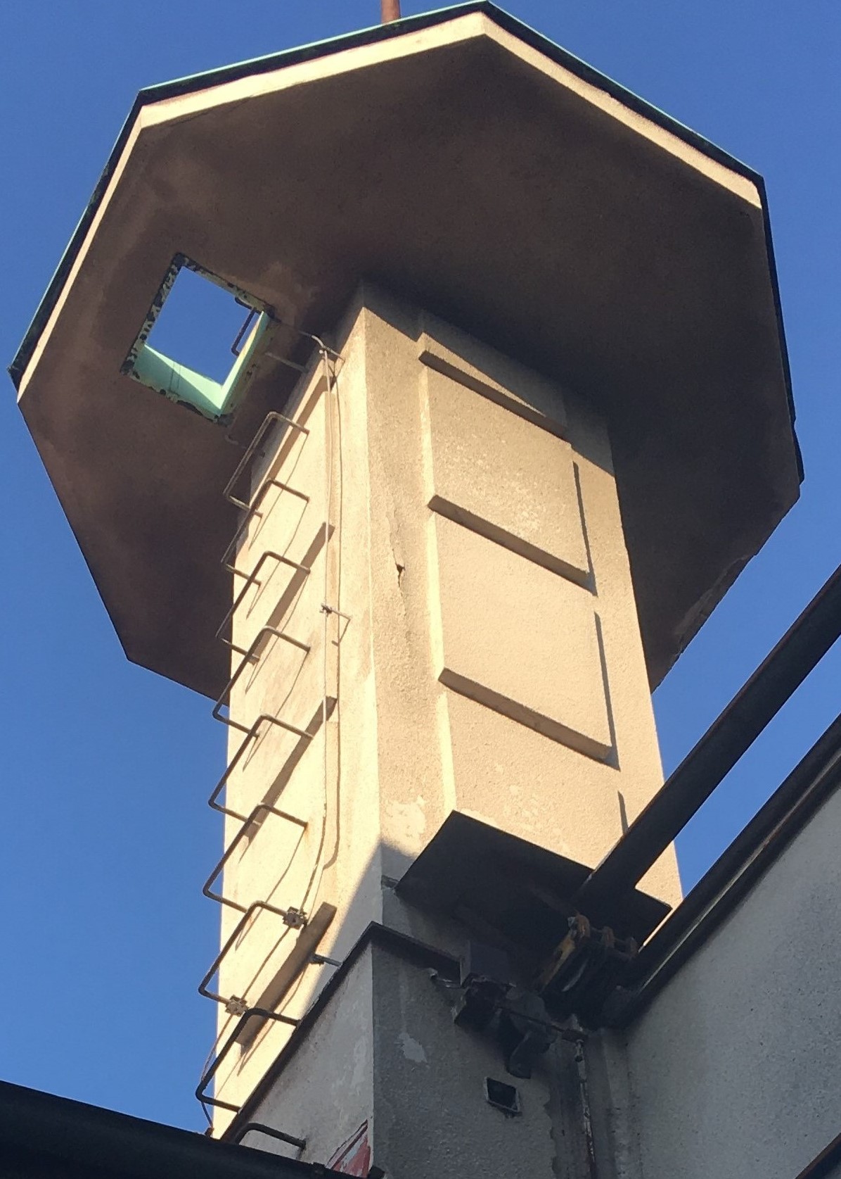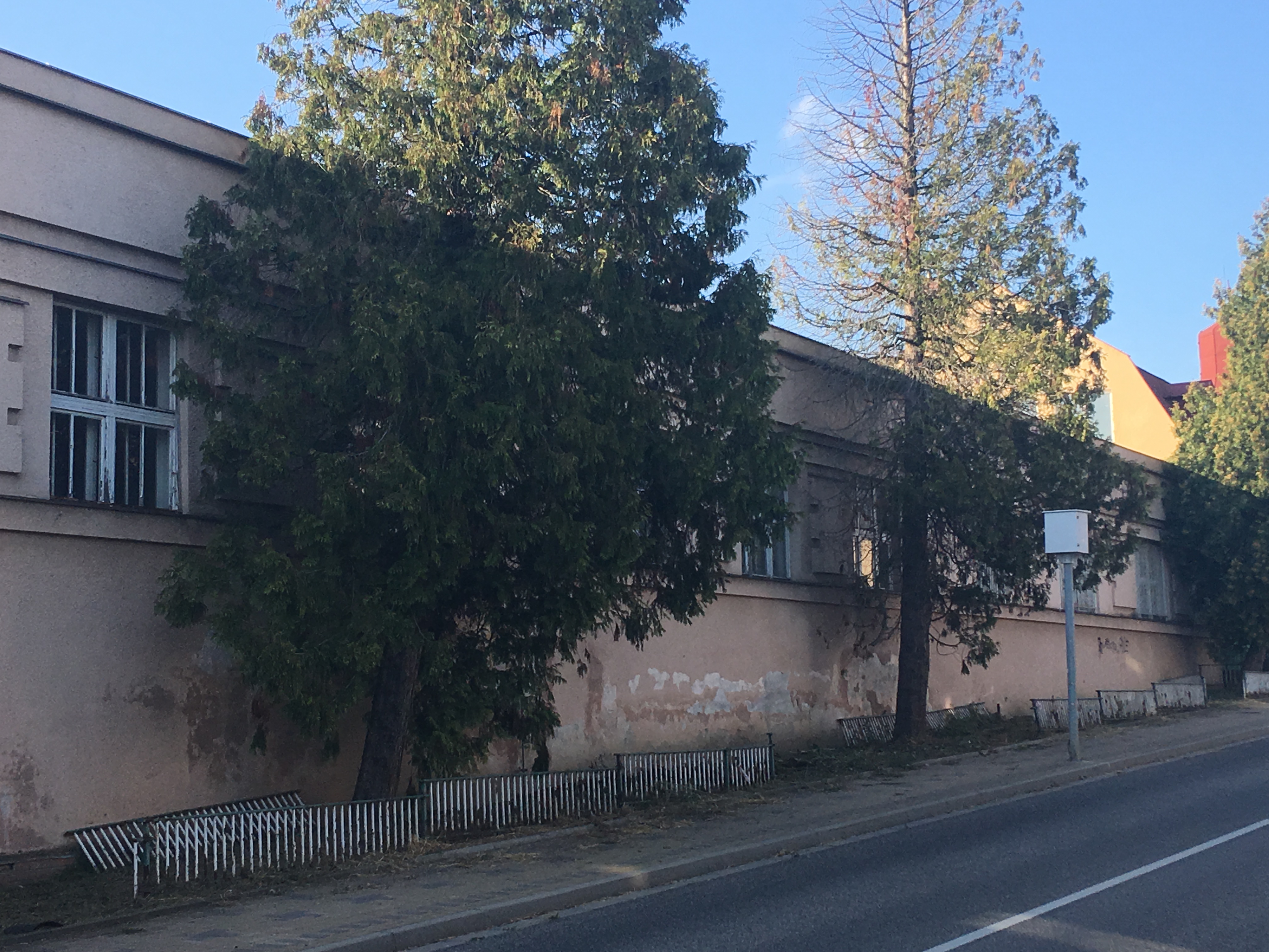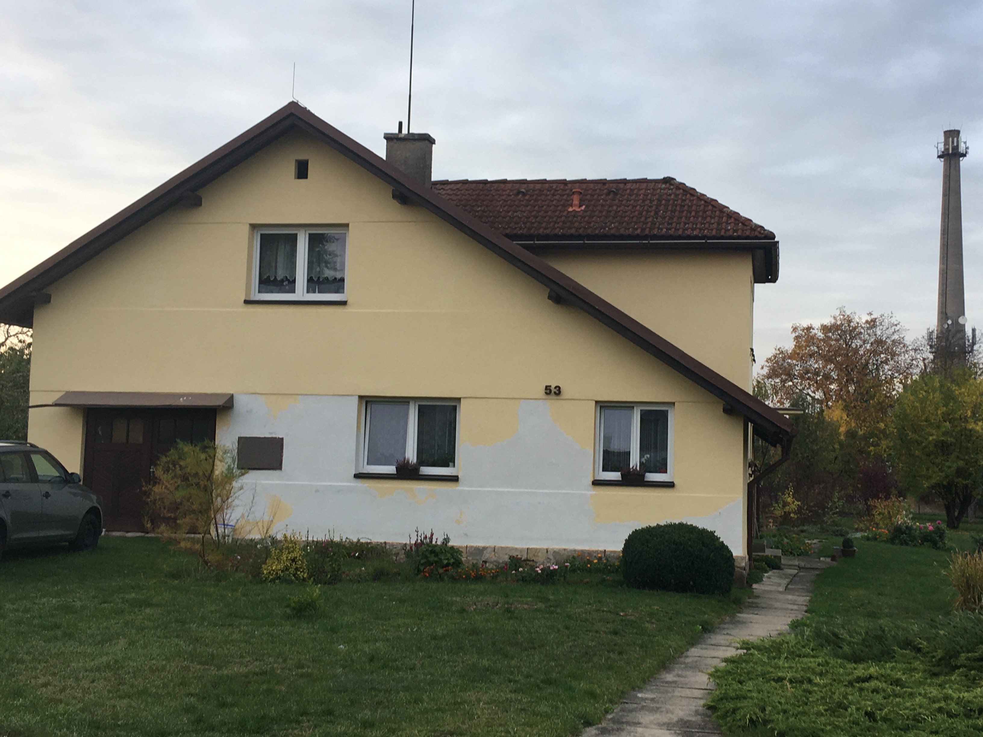 Domek pro zaměstnance, kam byla rodina v roce 1948 vystěhována. Květoslava Wodziková v něm žije dodnes. V pozadí tovární komín na pozemku továrny Bartoň YORD, 2019