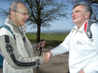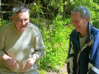 Petr a Venca (Petr Freund byl blízký přítel, se kterým se Václav seznámil ještě za jeho pobytu v Mnichově, kde ho i navštívil. Pamětníci rádi vzpomínají na doby, kdy se oba účastnili setkání na Parkinson chatu. Fotografie zachycuje jejich setkání na tradiční akci Společnosti Parkinson, z. s. - výstup na horu Říp při příležitosti světového dne Parkinsonovy nemoci.)