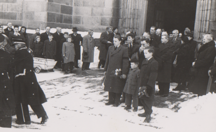 Pohřeb maminky Emilie v únoru 1951 v kostele svatého Vavřince ve Vysokém Mýtě. V centru fotografie synové, nejblíže fotografovi stojí pamětník Jiří Zedníček