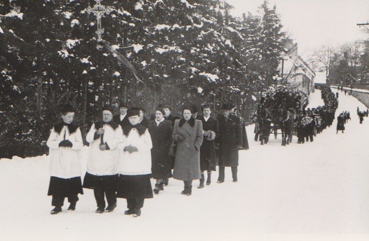 Čelo pohřebního průvodu směřující na hřbitov. V pozadí rakev tažená dvojspřežím. Manžel Emilie Zedníčkové, toho času v komunistickém kriminále, nebyl v únoru 1949 na pohřeb propuštěn