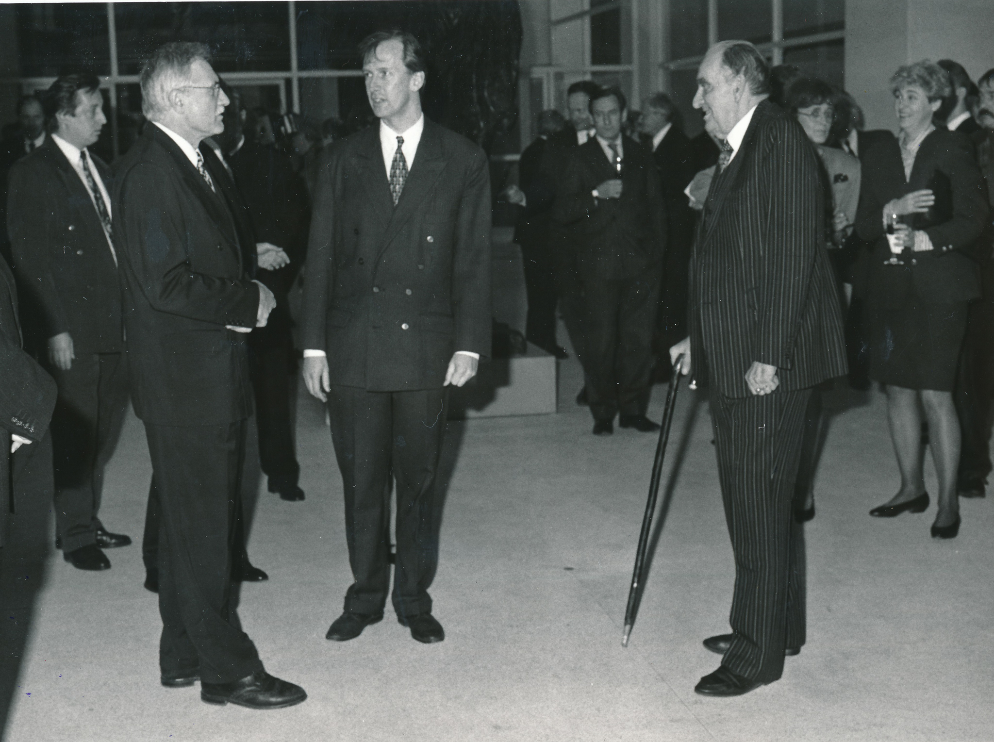 Otevření Veletržního paláce – zleva tehdejší předseda vlády Václav Klaus, Martin Zlatohlávek, bývalý ředitel Národní galerie Jiří Kotalík (13. prosince 1995)