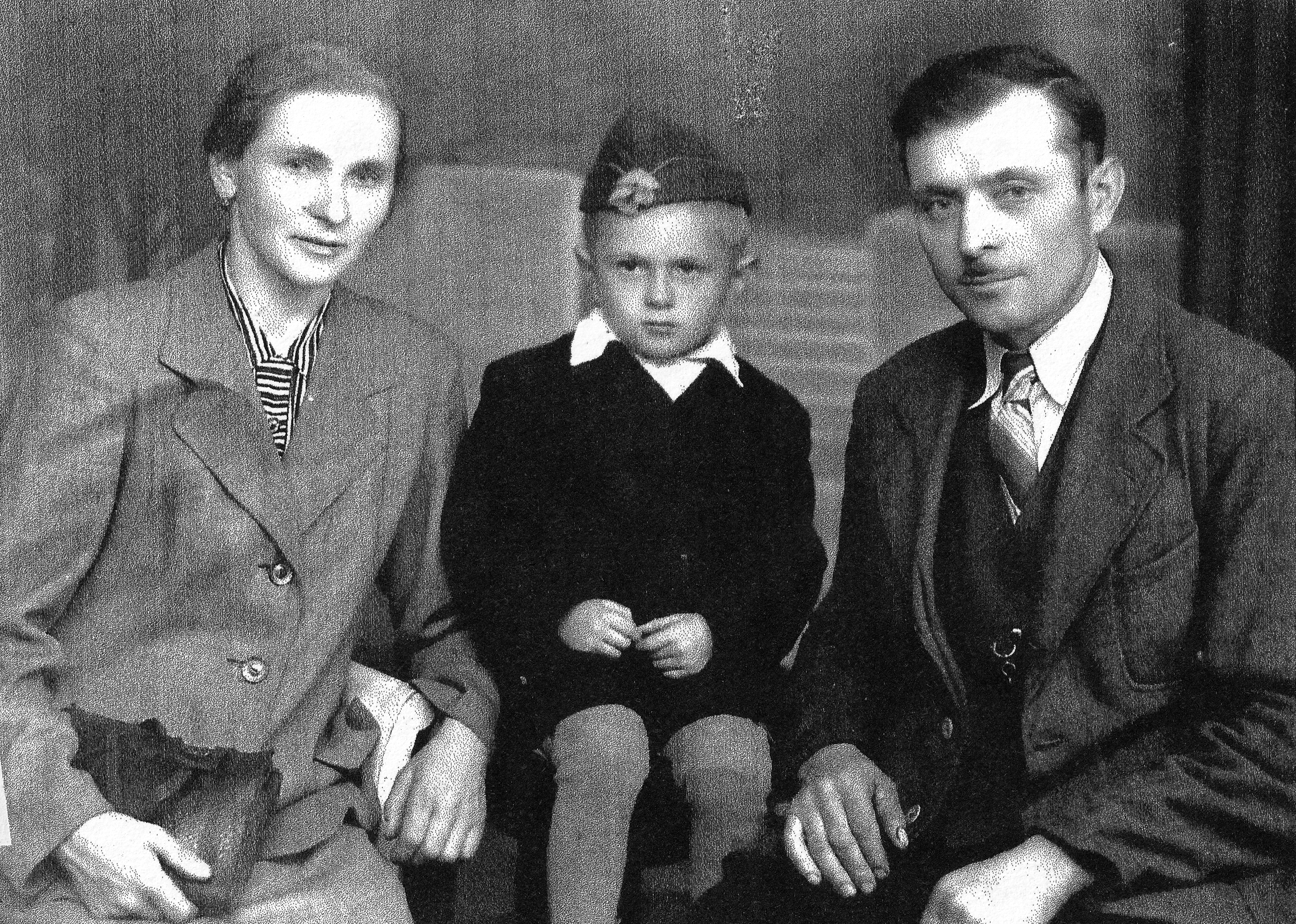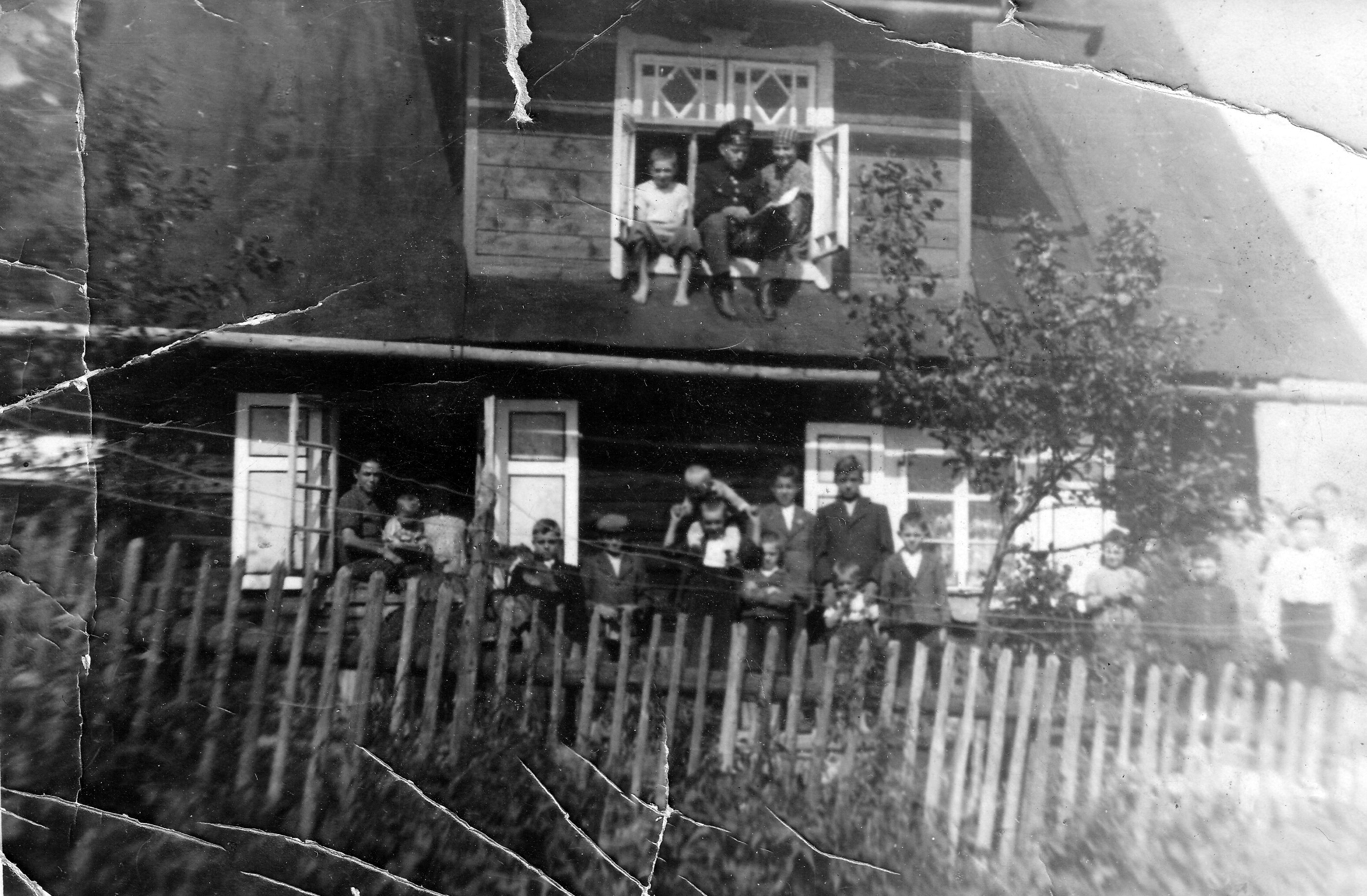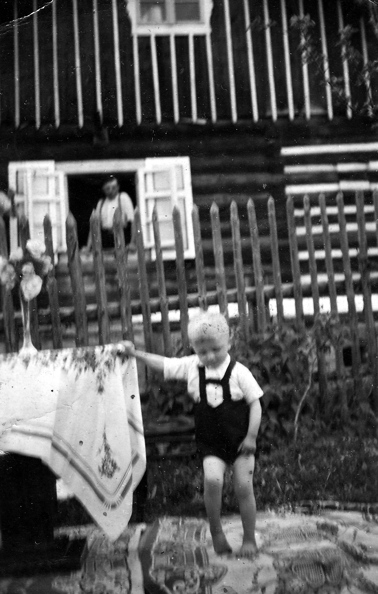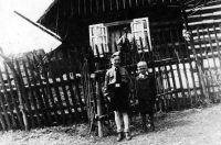 Ladislav Gavlas (on the shoulders of his older brother Antonín) in front of the family house, in the window his parents Pavel (in German uniform of a railwayman) and Johana, Mosty u Jablunkova - Filůvka, ca. 1939