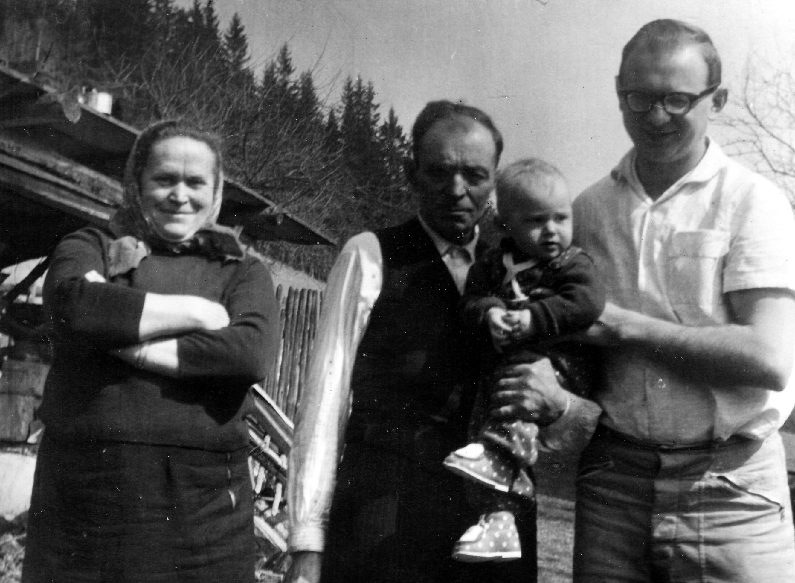 "In the spring of 1944, my mother sent me, a six-year-old boy, to pick some mushrooms so she could make me roasted or fried mushrooms for breakfast. I was used to go alone. In the woods I ran into two strangers. Of course, I was frightened and ran home. I told my mother that there were two men hiding there. I didn't notice if they followed me or not. My mother roasted the mushrooms and sat with me outside in the grassy yard between the barn, shed and other wooden houses. And then we saw these two men coming out of the woods. They asked my mother for some food. They were in civilian clothes, they didn't have any uniform. Of course they ate my roasted mushrooms. I was angry with them for that. Then they asked my mother for more food. She gave them some and they left. It was clear to my mother who they were. That was my first encounter with the partisans."