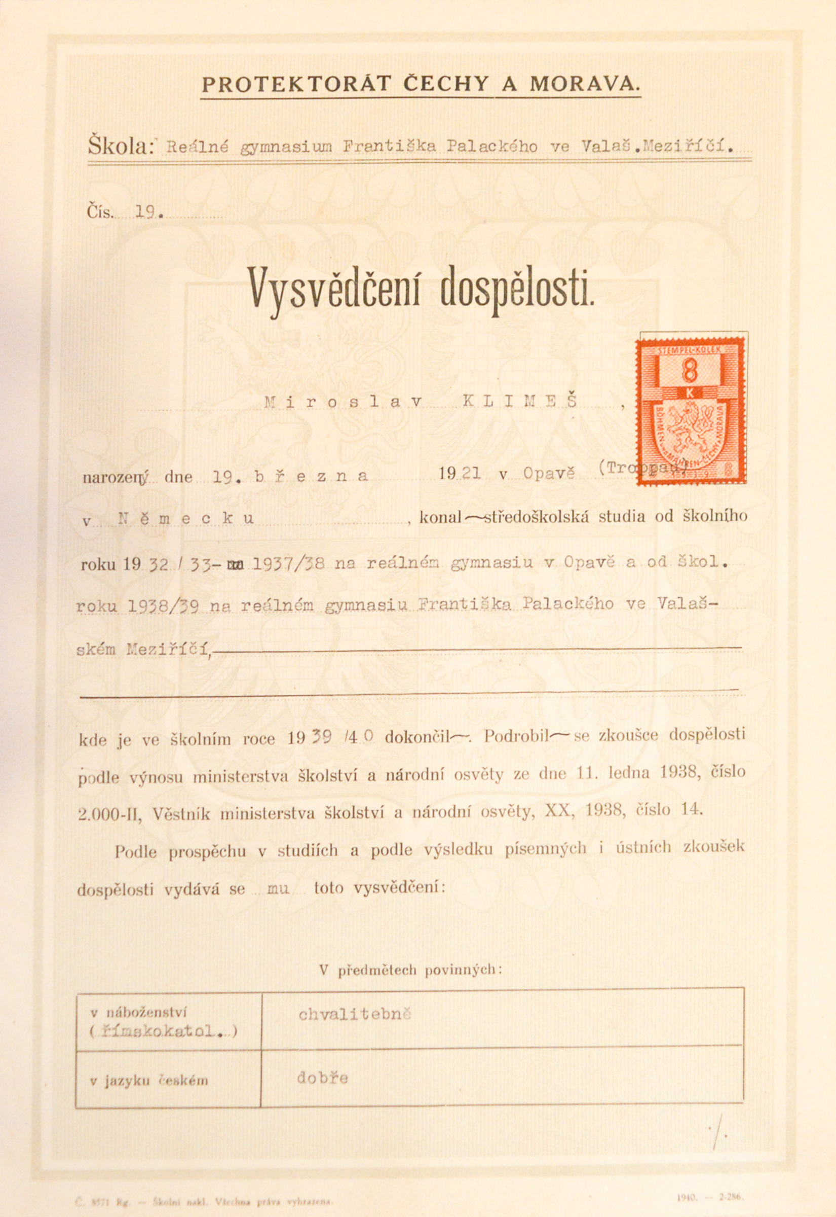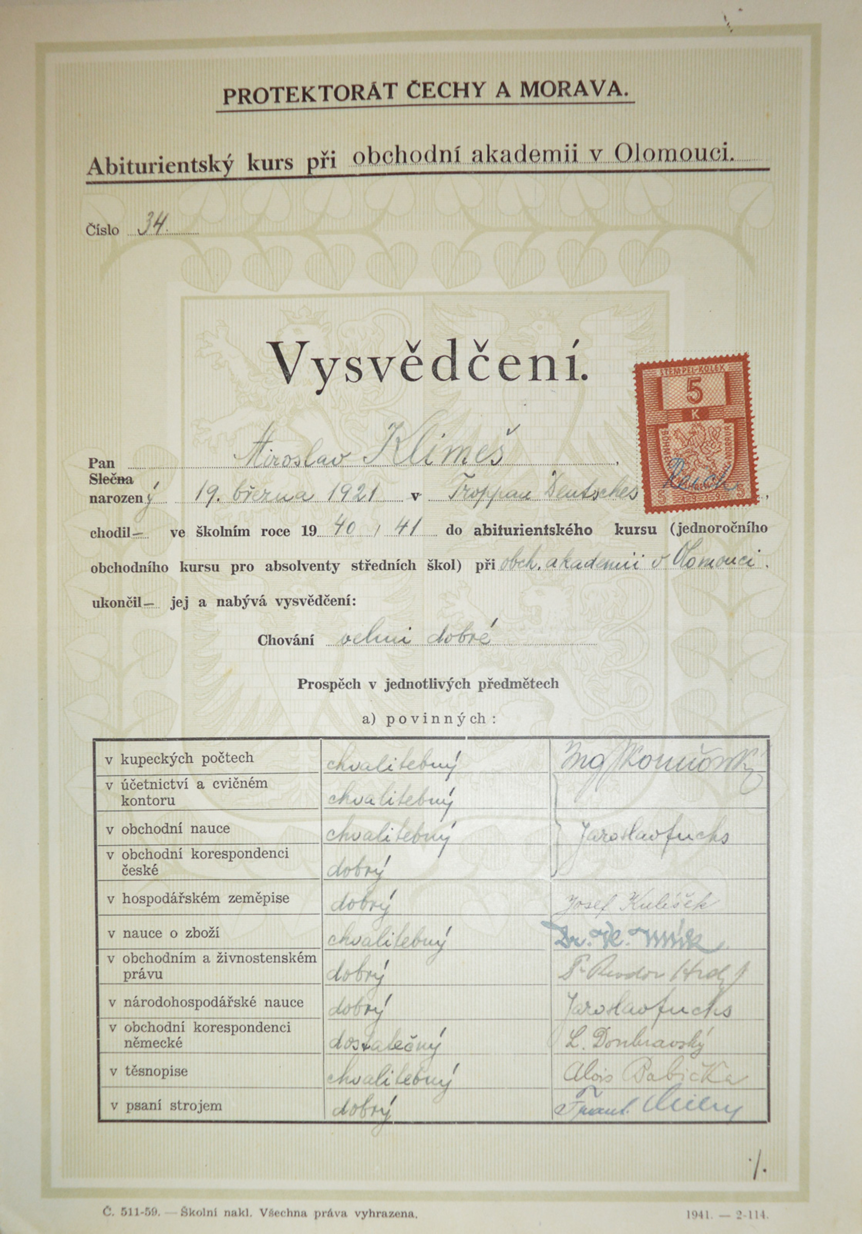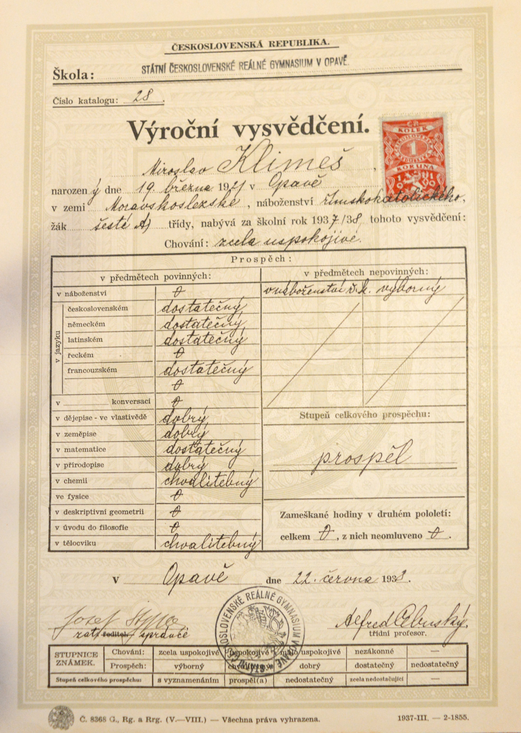 Miroslav Klimeš, Scout name Bagheera, was born on 19 March 1921 into the family of the stationmaster in Opava. He had two significantly older brothers who had fought in the Austro-Hungarian army in World War I. He joined the Sokol sports movement in 1930, but he was later enamoured by Scouting and became a member of the 1st Scout Troop Opava. The witness‘s unique Scout diary has survived from those times and serves as an excellent archival source. He made it up to deputy leader of the 1st Scout Troop Opava. During the tense times of 1938, his family left Opava and lived briefly in Olomouc. Miroslav Klimeš graduated from grammar school in Valašské Meziříčí in 1940. In the years 1940-1941 he attended a one-year supplementary course at a business academy in Olomouc and was then briefly employed at the Hospital Insurance Company of Private Employees. In 1942 he was assigned to forced labour, his summons sent him to the well-known company of Krupp Berta Werk Markstadt bei Breslau, where he worked in an office in a department called Bürofürsozialversicherung. Before his placement at Krupp, he also spent a short time in Essen, where he did manual labour - digging ditches and building accommodation. In January 1945 he did not want to have to move to a different assignment in Hirschberg, Silesia (now Jelenia Góra, Poland), and so he, his future Russian wife, and her family escaped back to Bohemia. He hid from the Protectorate authorities for several months. Miroslav Klimeš experienced the fighting and bombing preceding the liberation in the lonely settlement of Žimrovice near Opava. After the war he returned to his job at the Hospital Insurance Company of Private Employees and soon became district director of Hospital Insurance for Higher-Level Employees. After the war he married Rita, a Russian woman who he had brought with him from his forced labour in Poland; they had two children together. When the insurance companies were nationalised, Miroslav Klimeš worked at the travel agency Čedok, where he remained until his retirement. During Scout trips in the 1980s he met his second wife Milada Klimešová (née Hermanová), who was an important figure in the Opava Scouting scene.