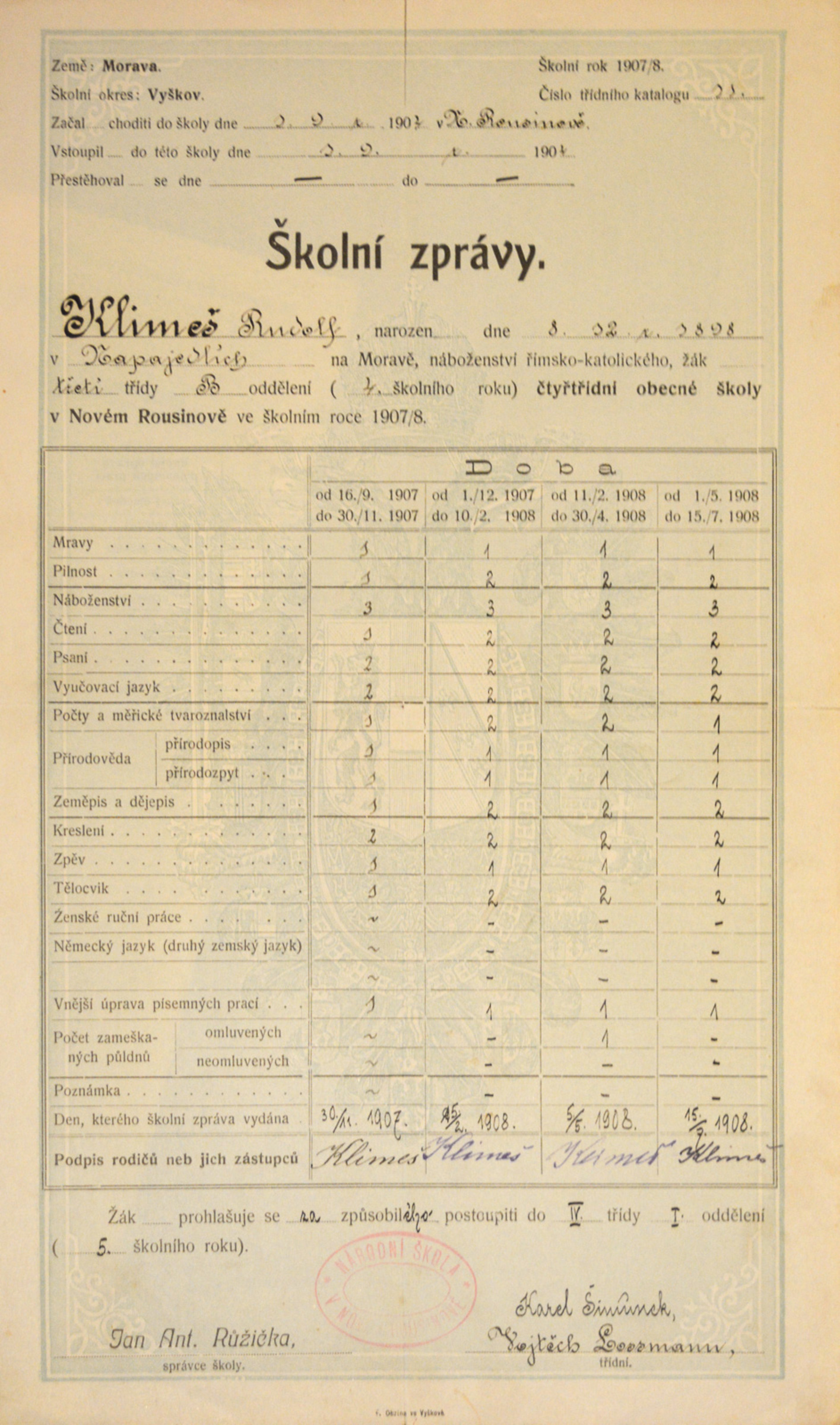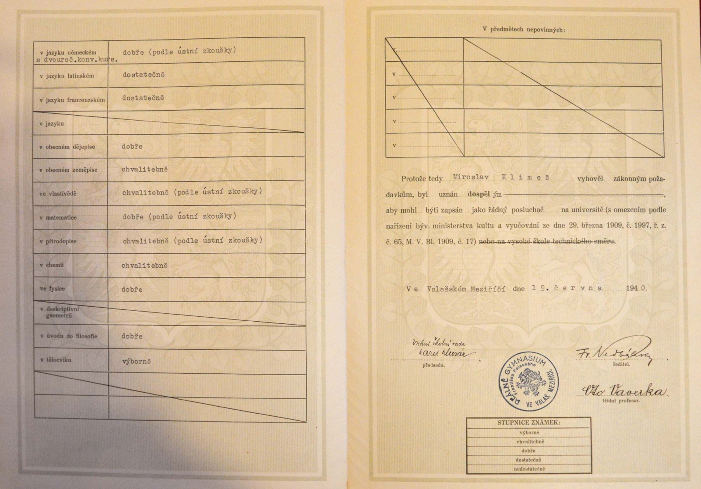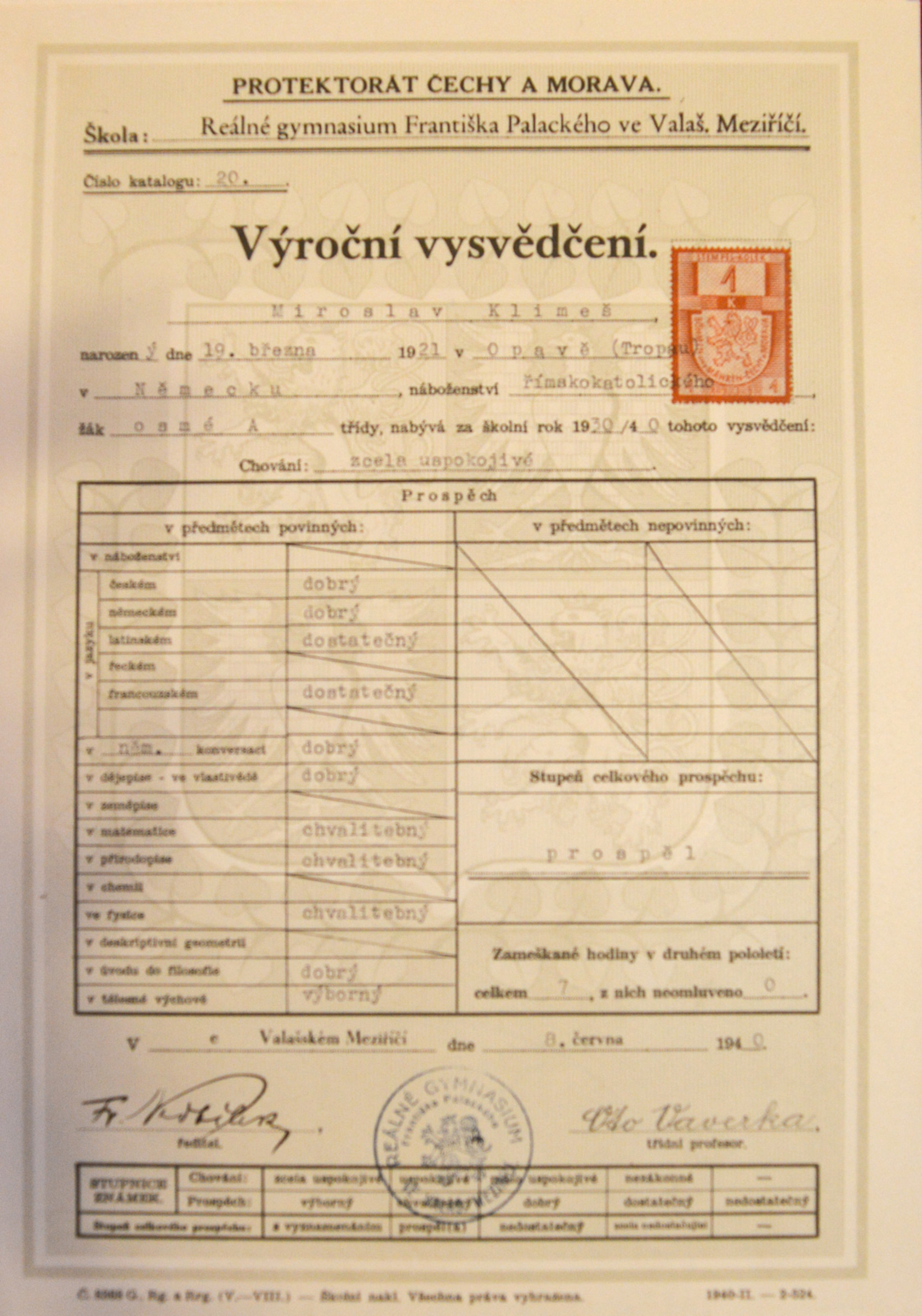 Miroslav Klimeš, Scout name Bagheera, was born on 19 March 1921 into the family of the stationmaster in Opava. He had two significantly older brothers who had fought in the Austro-Hungarian army in World War I. He joined the Sokol sports movement in 1930, but he was later enamoured by Scouting and became a member of the 1st Scout Troop Opava. The witness‘s unique Scout diary has survived from those times and serves as an excellent archival source. He made it up to deputy leader of the 1st Scout Troop Opava. During the tense times of 1938, his family left Opava and lived briefly in Olomouc. Miroslav Klimeš graduated from grammar school in Valašské Meziříčí in 1940. In the years 1940-1941 he attended a one-year supplementary course at a business academy in Olomouc and was then briefly employed at the Hospital Insurance Company of Private Employees. In 1942 he was assigned to forced labour, his summons sent him to the well-known company of Krupp Berta Werk Markstadt bei Breslau, where he worked in an office in a department called Bürofürsozialversicherung. Before his placement at Krupp, he also spent a short time in Essen, where he did manual labour - digging ditches and building accommodation. In January 1945 he did not want to have to move to a different assignment in Hirschberg, Silesia (now Jelenia Góra, Poland), and so he, his future Russian wife, and her family escaped back to Bohemia. He hid from the Protectorate authorities for several months. Miroslav Klimeš experienced the fighting and bombing preceding the liberation in the lonely settlement of Žimrovice near Opava. After the war he returned to his job at the Hospital Insurance Company of Private Employees and soon became district director of Hospital Insurance for Higher-Level Employees. After the war he married Rita, a Russian woman who he had brought with him from his forced labour in Poland; they had two children together. When the insurance companies were nationalised, Miroslav Klimeš worked at the travel agency Čedok, where he remained until his retirement. During Scout trips in the 1980s he met his second wife Milada Klimešová (née Hermanová), who was an important figure in the Opava Scouting scene.