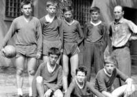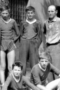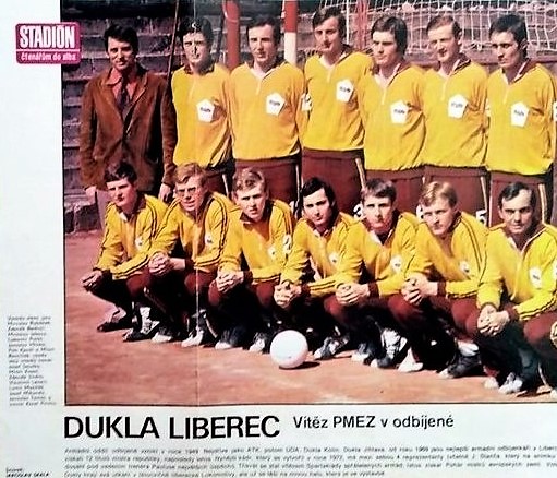 Dukla Liberec's trip to France in 1973. Vlastimír Lenert is far left; to his left are Milan Šlambor, Vladimír Zajíček and Jaroslav Tomáš. Coach Josef Paulus is facing away.