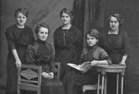 Grandmother Zdenka Cikánková (sitting on the right with a book) with her mother and three sisters. She is holding the book as a sign that she is the only one of her sisters going to college to support her mother and sisters after her father's death. But the sisters all got married, and grandma worked as a teacher after her studies