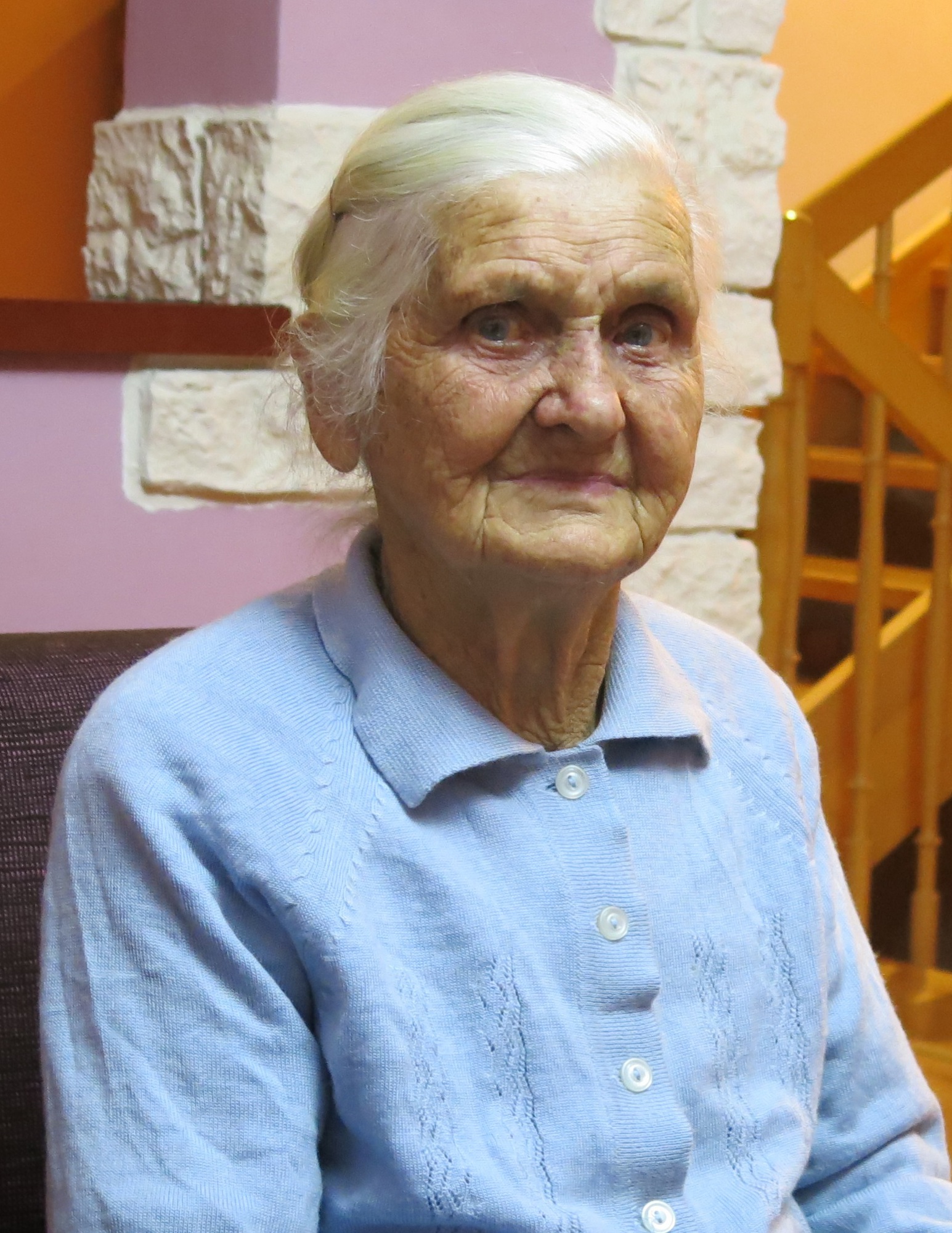"[…] Skończyłach prawie szkołe. Prawiech skończyła siódmóm klase – wojna wybuchła. I było trzeba być w domu. No ale, zaś to taki było, że za Polski chodziło się do szkoły i uczyło się języka niemieckiygo, godzina była. Ale jo nie chodziła mie się […] wiyncej nos nie chodziło. Wolałach być na ogródek grać w piłke. A potym jak przyszli Niemcy, jakby to się przydało. Ho, ho, ho! Kurczę pieczone! Ale, jak jo im też ale dała. Bo, jak potym […] jo chodziła do jednej uczyć się szyc, do tej krawcowej. I oni mie, ci Górnoslązacy, mie zgłosili na policje, że nic nie robiym, że to […] I Niymcy prawie mie zawiadomili, że móm pójść się odstawić do Frysztota (obecnie dzielnica Karwiny, Czechy) do urzyndu takiygo, pracowitygo. No i tożech tam zaszła, zgłosiła się żech we Frysztocie i dobre. I wróciłach do domu. I tam stela dostałach zawidomiyni, że mom iść na kolej do roboty. Na kolej do roboty. Myślałach se: 'No, isto kilof, kopaczke, tam trzeba cosik wziónć, ni?' No i […] ale dostałach zawiadomiyni kierogo dnia mom się tam stawic. Jo przyszła do Zebrzydowic tam, no i zgłosiłach się. I tam była tłumaczka, co mi przetłumaczyła, co mi to mówióm, a co jo im zas mówiła na niemiecki. I jo tam siedziała i posłuchałach żech to wszystko co mówili: no, żech je szczupło, wysoko, że, żech je tako bystro, ze […] Tam mówili miyndzy sobóm, a jo to wszystko rozumiała. Jo się tak chonym nauczyła niemieckiego, takich, takich, takich słów. Powiedzmy tak: essen, schlafen, singen, tanzen, springen. Taki ch żech się nauczyła, tak że rozumiałach to óni mówióm. Żech je szczupło, wysoko, żech je zdolno, że mogym być za konduktorke. Dobre. I potym mi to […] A ta mi to tłumaczyła. A jak już potym […] jak już prawiła, że my skóńczyli, ze już mogym odyjśc, ale muszym się jutro zgłosić z powrotem tu, że dostanym bilet, pojadym do Bogumina i w Boguminie bydy parowozy przepinać, wagony odpinać, i ty, ty […] co w lewo pojadóm pociągi […'] no, jak to się nazywo? Zwrotnice. Że wszystko to bydym robić. A oni to mówili, a óna to tłumaczyła. I jo to rozumiała. I jak już potym prawili, że już mogym iść, to jo potym stanyła, i jo mówiym: -Danke schoen! - Was? Sie kennen Deutch! - mi prawiom. Jo prawiym - Ja, ich lerne mich - Schön. Das lernen wir zusammen arbeiten! I dobre. - Jawohl! Das freu mich. No, i Heil Hitler!”